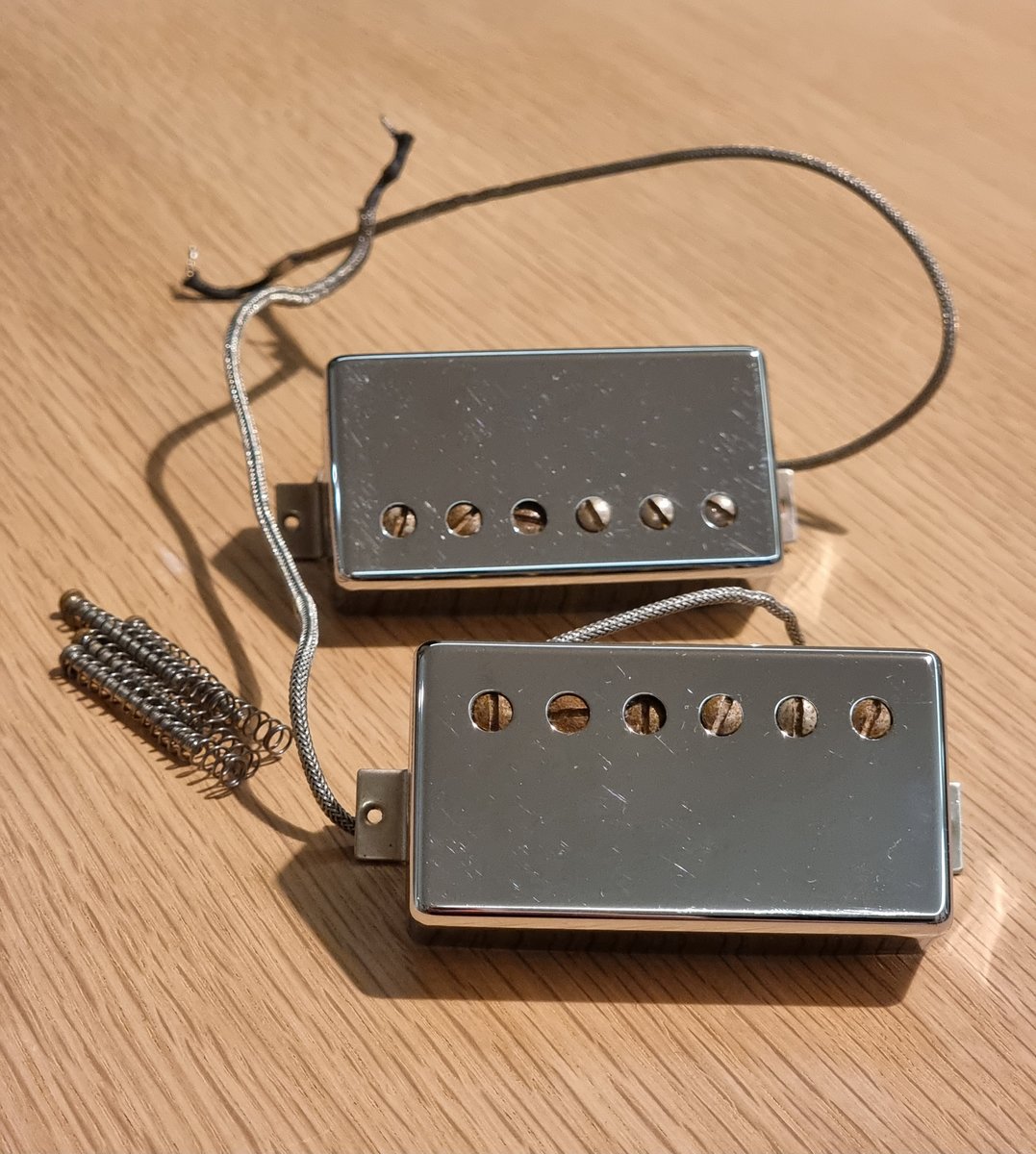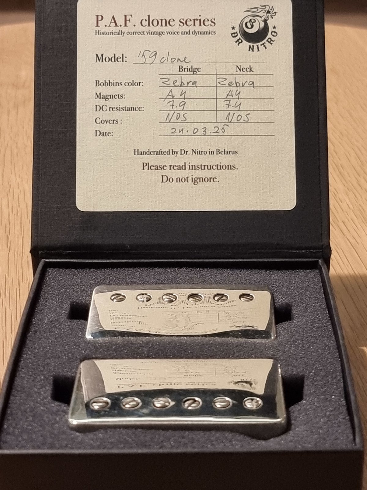 | Erittäin asiallinen PAF-setti. Selkeä ja erotteleva soundi, mutta rähisee kuitenkin tarvittaessa mukavasti. Lippuset ja lappuset ja ruuvit tallessa. En ole koskaan näistä kuoria irroittanut, mutta kelojen väritys on "Slash zebra", mikäli sillä mitään merkitystä on. Alnico 4 -magneetit, kaula 7,4 kOhm ja talla 7,9 kOhm. PS. Sama seppä tekee myös melkoisella pieteetillä kitaroiden relikointeja, löytyy Youtubesta nimellä Dr. Nitro tai 8Bomb Custom. Hinta: 280 € | |