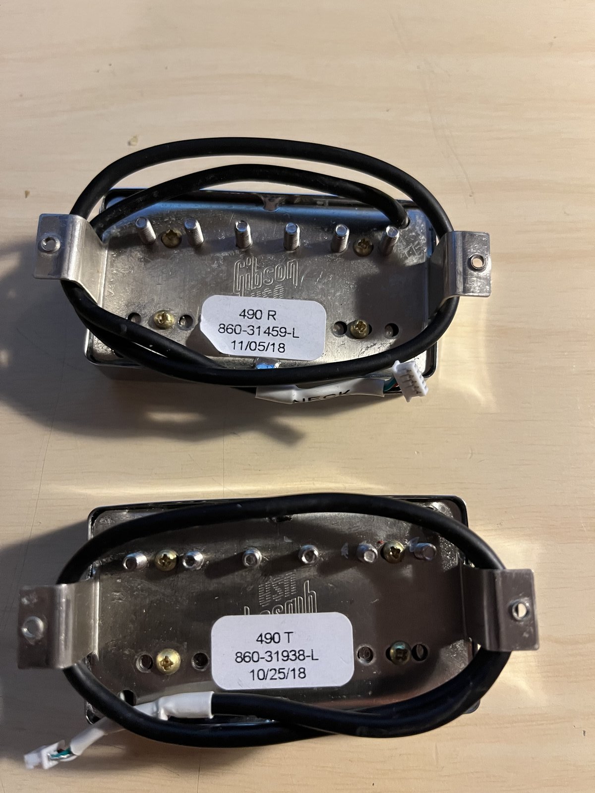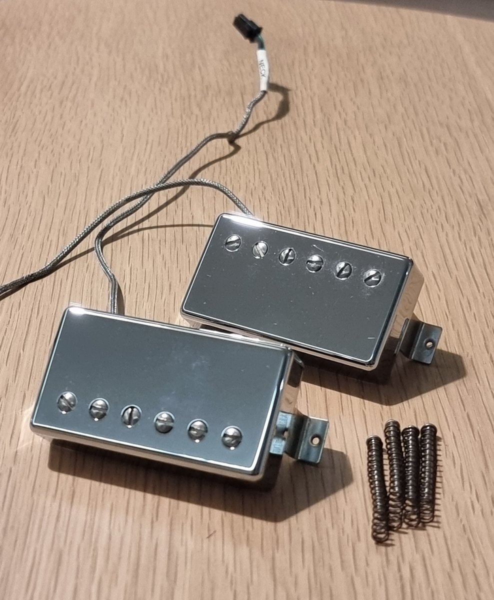 | Vuodelta 2012, mutta suht siistissä kunnossa. Nämä on riipaistu piirilevy-Gibsonista, eli piuhojen päissä on pikaliittimet. Toki jos moiset modernit kotkotukset puistattaa, ne voi halutessaan nyppäistä pois. Alnico 2 -magneetit. Hinta: 180 € | |