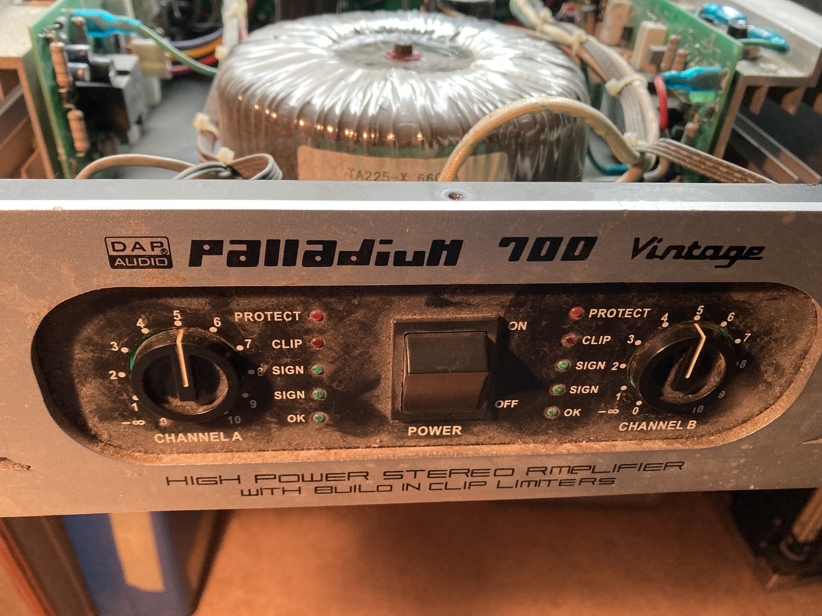 Palladium 700 vintage PA-vahvari. Tästä oli toinen kanava pimeä. Toisen kanavan 7A sulakkeet, päätekivet ja lämpökytkin niksnaks. Tod näk jumittava flekti syynä. Vaihdoin flektit, ja edellä mainitut osat. Hyvin toimi. Sitten alkoi käryämään, joten sammutettiin. Kuvissa näkyy kyllä, missä käry on käynyt, mutta en jaksa tän kanssa enää painia, kun ei mulla tälle ole tarvettakaan. Että jos joku haluaa tästä jatkaa, niin toimivan vahvistimen saanee tästä helpohkosti. Tai otat nuo kärynneen kanavan sulakkeet irti ja käytät monovahvistimena..? Hinta: 30 € | |