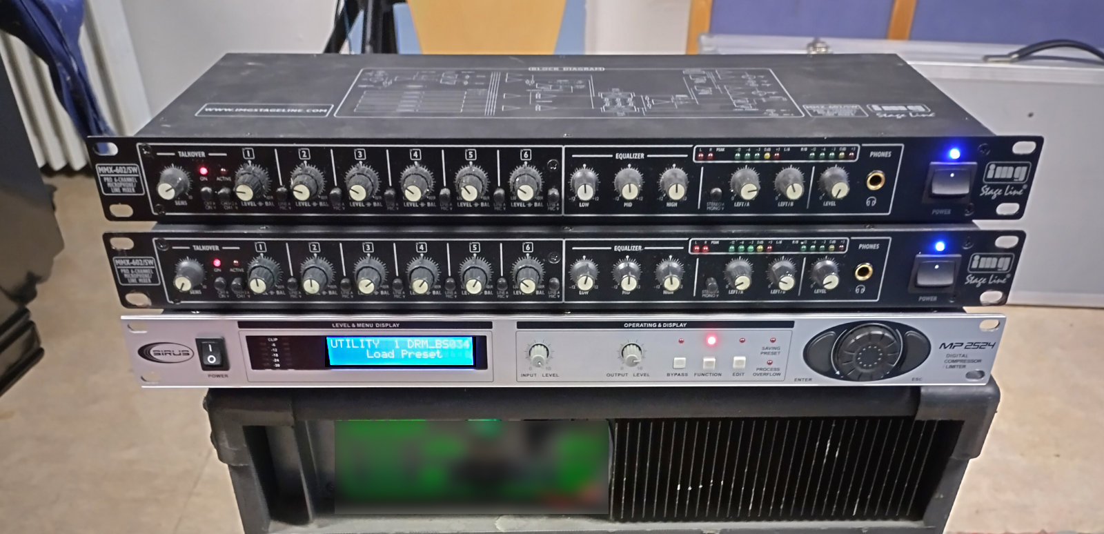 Tuossa muutama räkkipaavo joutavana. IMG Stageline MMX-602/Sw mic-line-mikseri 2 kpl Metallikotelo, asialliset liitännät, kuulokevahvistin. SIRUS MP 2425 digitaalinen kompura-limitteri Asetukset muistipaikoille. Toimivat ok, jäivät puretusta kiinteästä asennuksesta. Googlaa tarkemmat tiedot. Hp. IMG 20¤ / kpl tai molemmat 30¤. SIRUS 30¤ tai kaikki yht. 50¤ tai tarjous. Kts, myös muut myytävät kotisivun linkistä, asennus- ja projektikamaa, nauhureita ja mm. Studer-mikseri . Yhteydet löytyy kirjautuessa, nopeiten txt/gsm, miel. arki-iltaisin. Hinta: 20 € | |