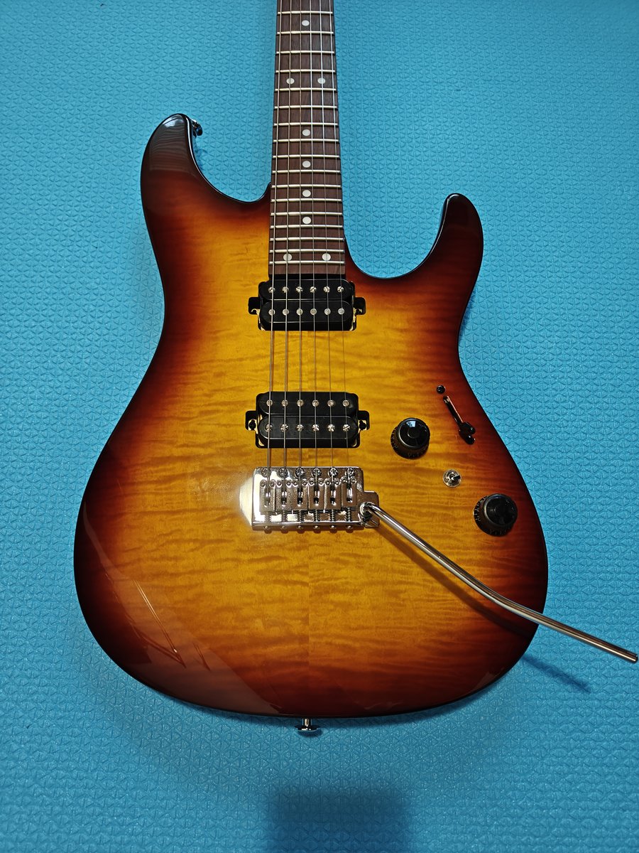 | Todella pitkä sustain neck-thru -rakenteen ansiosta. Nauhoissa hyvin terästä jäljellä, vaikuttavat olevan extra jumbot. Pitää vireen, kaula suora. Helppo soittaa. Kaikki sävelet soi hyvin/ei särise. Kaulan lakan pintaa vähän hiottu jotta pienempi kitka soittaessa. Intonaatio kohdillaan. Kaulamikin piuhat otettu kitaran sähköistä jostain syystä irti. Siitä halvalla kitara loppuelämäksi, itse tykkään enemmän single coil -soundista ja paksummasta kaulasta. Vaihdossa voi tarjota nylonkielistä akustista. Kuopiossa, mutta kulkeutuu myös Savonlinnaan. Hinta: 350 € | |