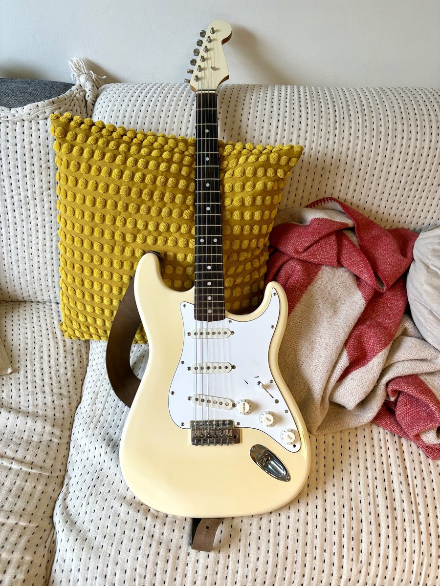 | Harvinainen japanilainen neck-thru Strat 70-luvun lopulta / 80-luvun alusta. Kitara on jälkikäteen maalattu ammattilaisen toimesta Olympic White värillä ja siihen on asennettu Tremsetter. Kaikin puolin erittäin hyvä kitara. Sustainia riittää, kuten neck-thru-kitaralta sopii odottaa! Mukaan pehmeä laukku. En mielelläni postita, mutta toimitus voi onnistua, jos matka on kohtuullinen. Vaihdot? Hyviä kitaroita ja pienehköjä putkivahvistimia voi toki ehdottaa. HP: 800 ¤ Hinta: 800 € | |