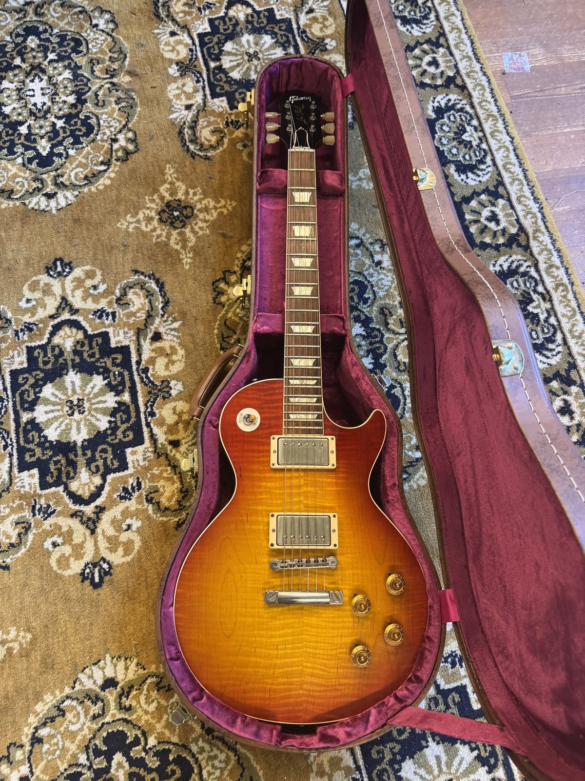 | Gibson Les Paul Artisan, sarjanumero 72238024, valmistettu Kalamazoon tehtaalla, Michiganissa, USA:ssa 22. maaliskuuta 1978, tuotantokappale nro 24. Tobacco sunburst -väri, kauniit helmiäiskoristeet, ”kullatut” metalliosat, alkuperäisessä kunnossa. Sarjanumeron lukuohje: https://www.gibson.com/en-eu/pages/serial-number-search Kitarani numero on 72238024, jolloin YY = valmistusvuosi on 1978, DDD= 223, päivämäärä siis 22. pnä maaliskuuta ja RRR = 024, joten Artisan on valmistettu Kalamazoon tehtaalla, Michiganissa ja on tuotantokappale 24. Gibson esitteli Artisan-mallin vuonna 1977. Siinä on sydän- ja kukkakuviot otelaudassa, runsaat koristelut lavassa sekä helmiäis- Gibson-logo. Siinä on kolme Gibson Humbucker -mikrofonia, sekä vuoden 1978 TP-6 hienoviritystalla. Painoa on liki 5 kiloa. juttuvinkki: https://lespaulforum.com/homesite/slubarticle/artisan/artisan1.03.html Artisanin esittelyä Les Paul Artisan esiteltiin loppuvuodesta 1976 rajoitettuna erikoismallina,mutta osoittautui niin suosituksi, että sitä valmistettiin vuoteen 1982 saakka. Siinä on helmiäisupotukset (”hearts & flowers”) otelaudassa ja lavassa, sekä Gibson-logo helmiäiskirjoitusasussa. Malli julkaistiin aluksi kolmella mikrofonilla. Kaulamikrofoni ja tallamikrofoni ovat Gibson Series VII -humbuckereita, ja keskellä on Gibson "Super Humbucking" -mikrofoni. Kytkennät ovat Custom-mallille perinteiset: vain kaula, keski + talla, tai pelkkä talla. Gibsonin Schaller-virittimet, monikerroksiset reunalistaukset rungossa, lavassa ja pleksissä, mahonkirunko kolmiosaisella vaahterakannella, kolmilaminoitu vaahterakaula, ebenpuuotelauta. Kaulaprofiili on matalampi kuin monissa 70-luvun Les Pauleissa, lähempänä 1960-luvun tyyliä. Paino jää hieman alle 5 kilon. Artisaneita rakennettiin Kalamazoon alkuperäistehtaassa aina tuotannon loppumiseen 1982 asti. Kitara on yleisilmeeltään siisti ja alkuperäinen. Lakassa on pieniä kolhuja ja jälkiä. Mikkien kultaus on hieman kulunut . Kaikki metalliosat ovat alkuperäisiä paitsi hihnalukot. Alkuperäisetkin kuuluvat kauppaan. Elektroniikka on koskematon. Laukuksi joko vanha vahvaa mojoa henkivän osumaa ottanut tai siisti, melko uusi aski. Vrt, Artisan hintaan $7,000.00. https://www.retrofret.com/product.a … an-Solid-Body-Electric-Guitar-1977. Fasessa on alan harrastajia: https://www.facebook.com/groups/381059082363011/search/?q=artisan Siellä Timo Nykyri (Bluebird): “There are 6 Artisans in Finland, as far as I know. I have on of the, a 1977. Tämän yksilön on minulle edellisen omistajan mukaan tuonut Suomen Mike Estes (historiikissa mm. Lynyrd Skynyrd, Blackfoot ja Skinny Molly ja on keikkaillut paljon Suomessa), joka myi kitaran jo edesmenneelle frendille. Itselläni kitara on ollut noin 10 vuotta, aika vähäisellä kotikäytöllä. Lähestymiset tekstarilla, kiitos. Hakukauppa. Koesoitto järjestyy. Ei vaihtoja. Kitara poistuu rakennuksesta, kun maksu on tililläni. Hinta on 4 700 euroa. Hinta: 4700 € | |