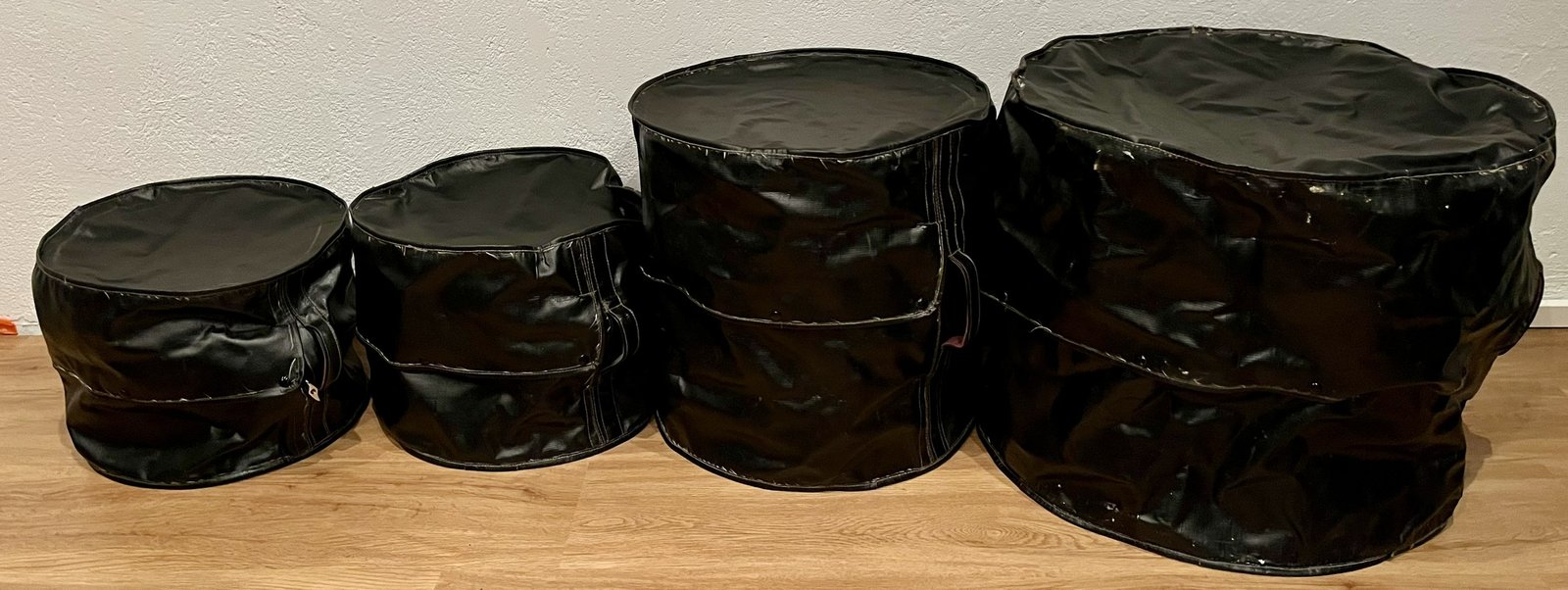 | Nahkaiset rumpulaukut Rumpujen max mitat vanteineen 20”x18”, 16”x16”, 13”x11”, 12x10” Hinta: 35 € | |