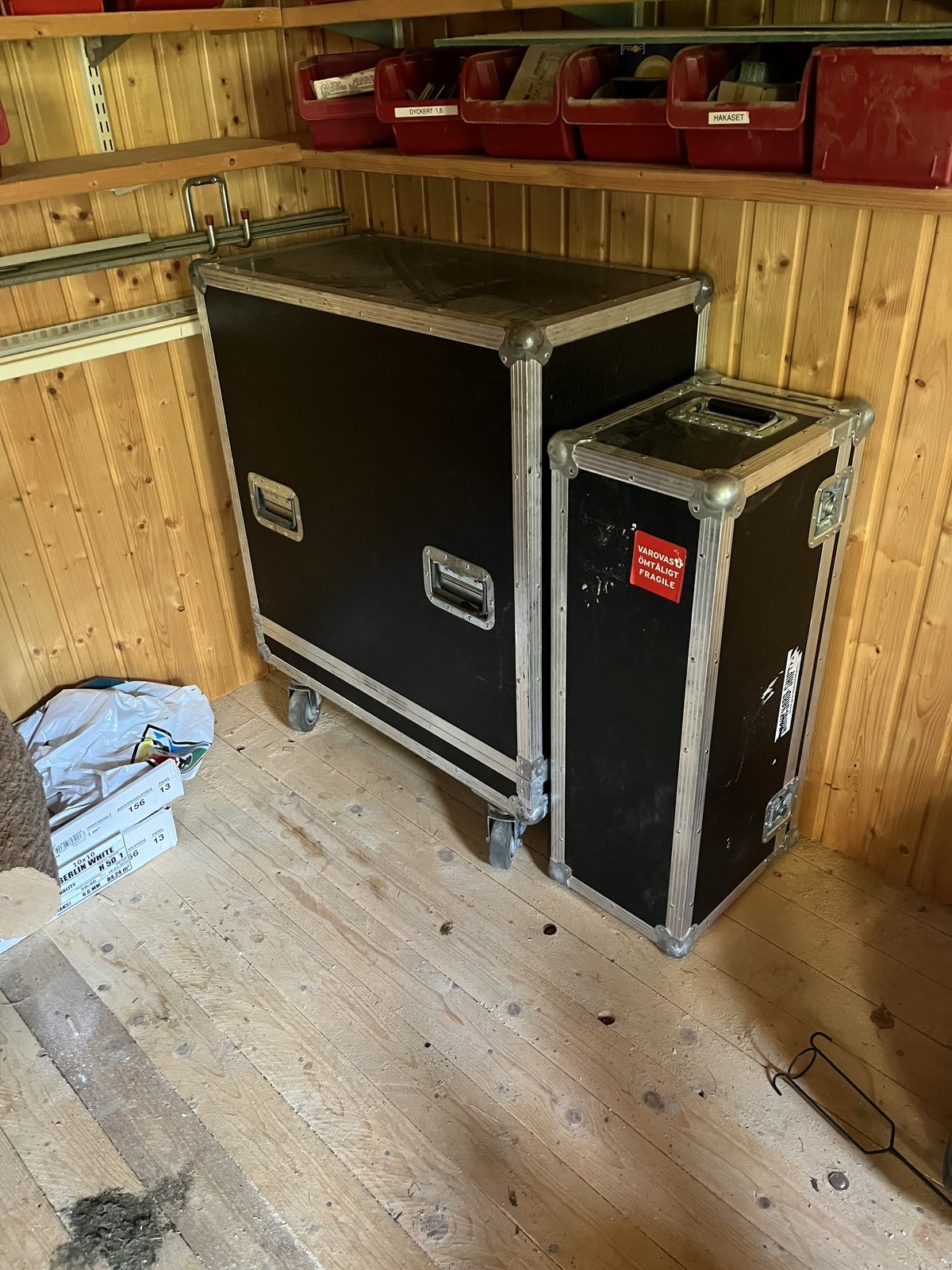 Myyntiin itse tehty kuljetuslaatikko. Hyvässä kunnossa. Koko noin 1x1m. Laatikon lokeroita pystyy helposti muuttamaan, koska ovat ruuveilla kiinni. Itsellä laatikko on toiminut kaapeleiden/mikkien kuljetuslaatikkona keikoilla. Lähetys ei onnistu, mutta kuljetus Tampereella mahdollista, jos nouto ei onnistuisi. Hinta: 10 € | |