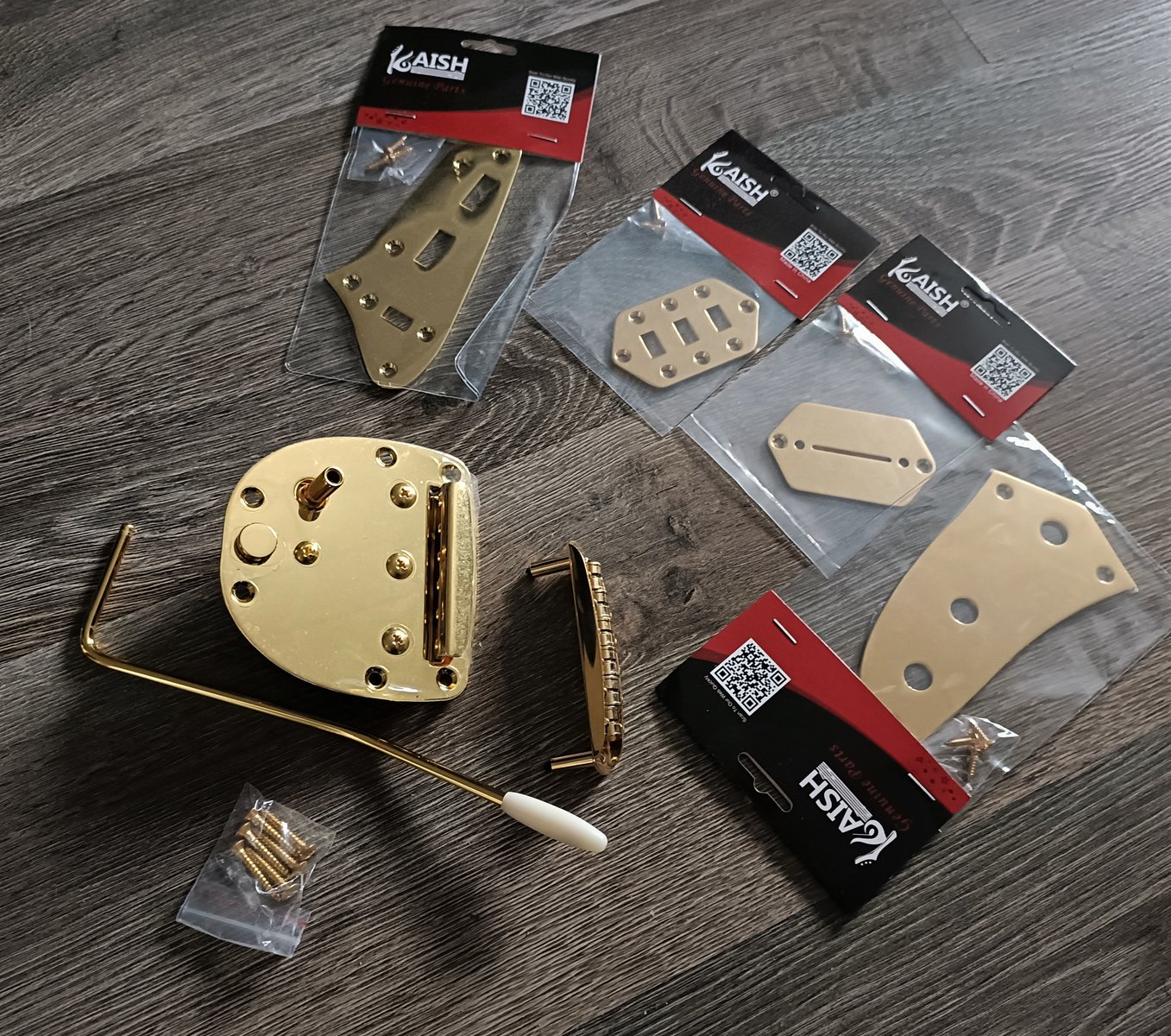 Kultaista hardwarea jaguariin! Virittimet Klusonit, muut Kaish eli perushyvää import-kamaa. - talla 9,5" ja 52,5 mm, thimblejä ei messiin - lukollinen vibra, kampi aged white tms nupilla - rhythm circuit-lätkä - control panel-lätkä - normi kytkinlätkä ja Marr-lätkä (tai vain jompikumpi, jolloin kymppiä halvemmalla) - virit Kluson MLV6LG, päältälukittavat vintage-tyyliset (2. kuva, alemmat) Hinta sis. Matkahuolto-kulut! Hinta: 150 € | |