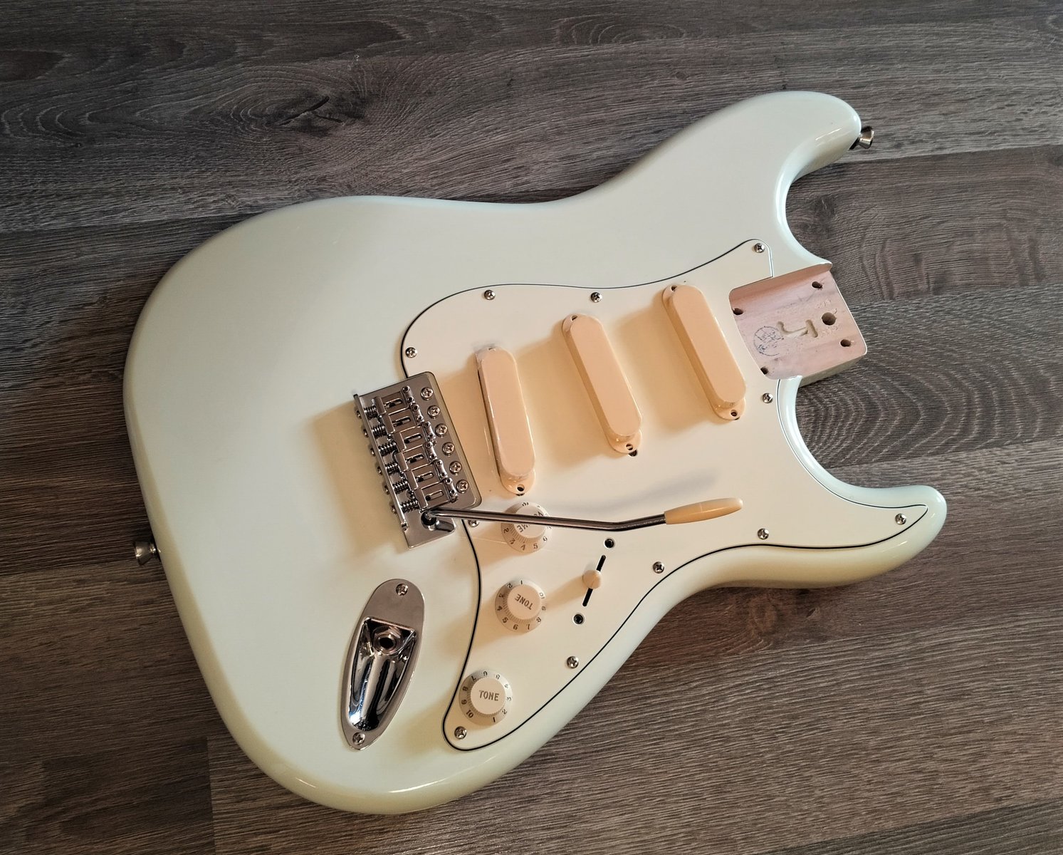 | - stratorunko - Jet JS-300:sta - olympic white, kellertävä - muovit kermaiset - isoblokkinen vibra push in-kammella Ei sähköjä, mutta muovit messiin: - potikannupit ja switch tip orkkikset - mikkikuoret mustang-tyyliset, kermaiset Tai ilman näitä kympin halvemmalla! Painoa tässä kuosissa 2,2 kg, täyspaksu (44,5 mm) runko. Hinta sis. Matkahuolto-kulut! Hinta: 100 € | |