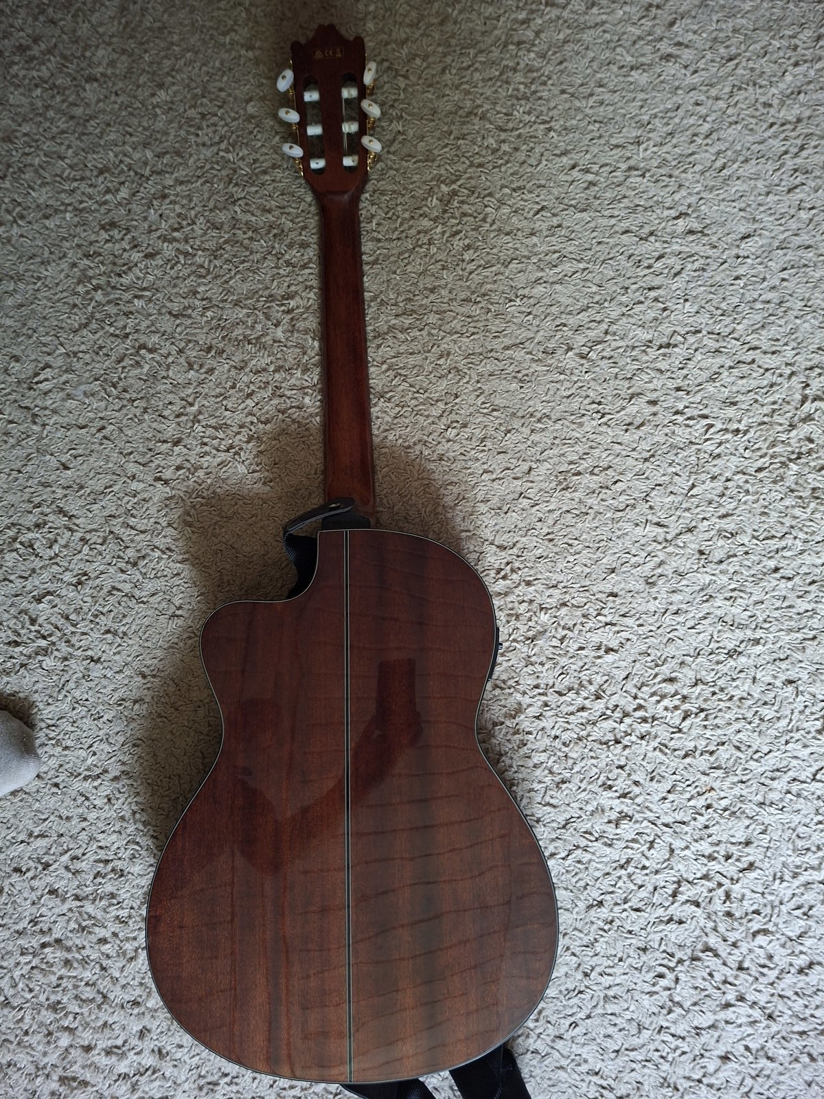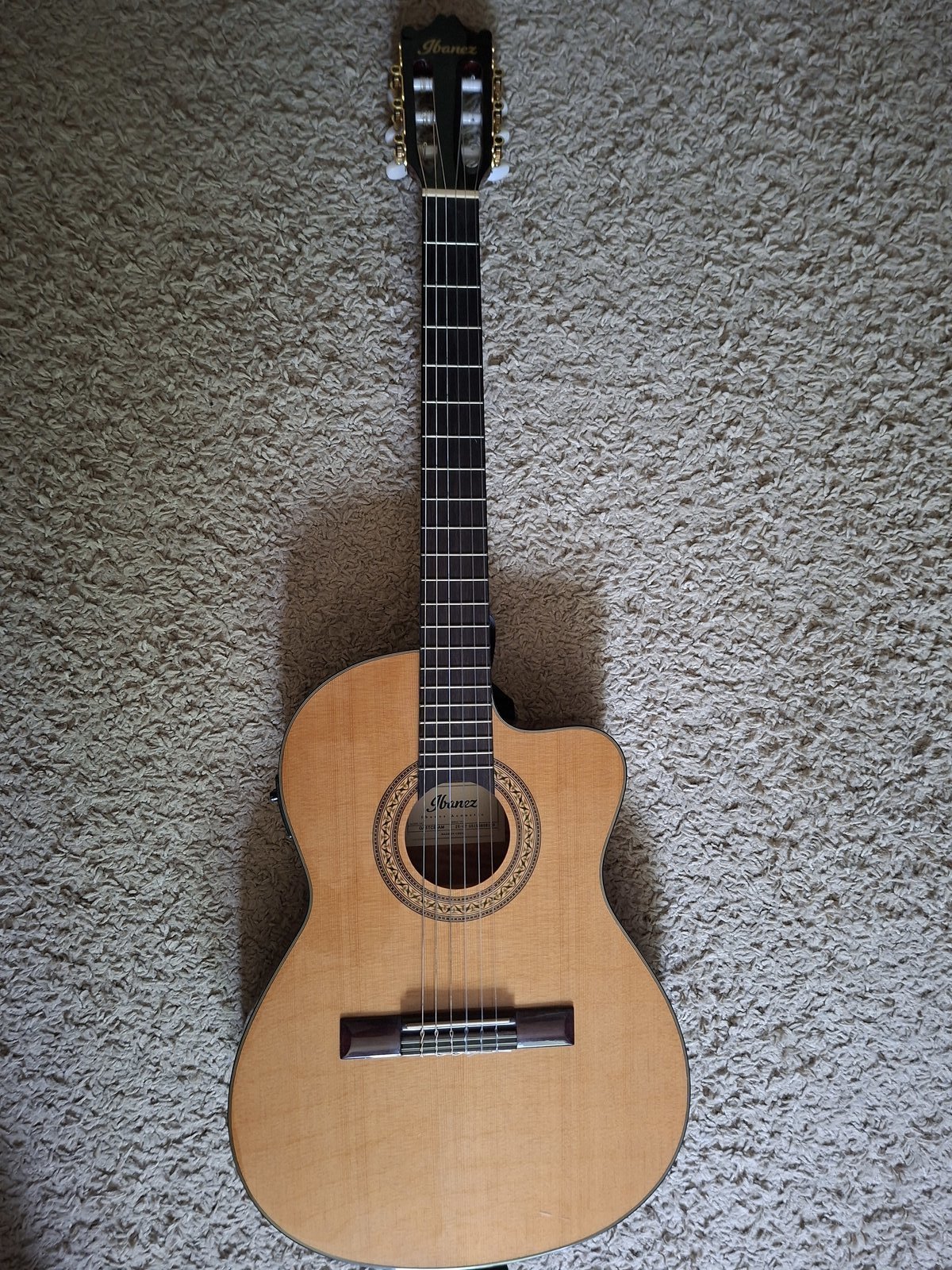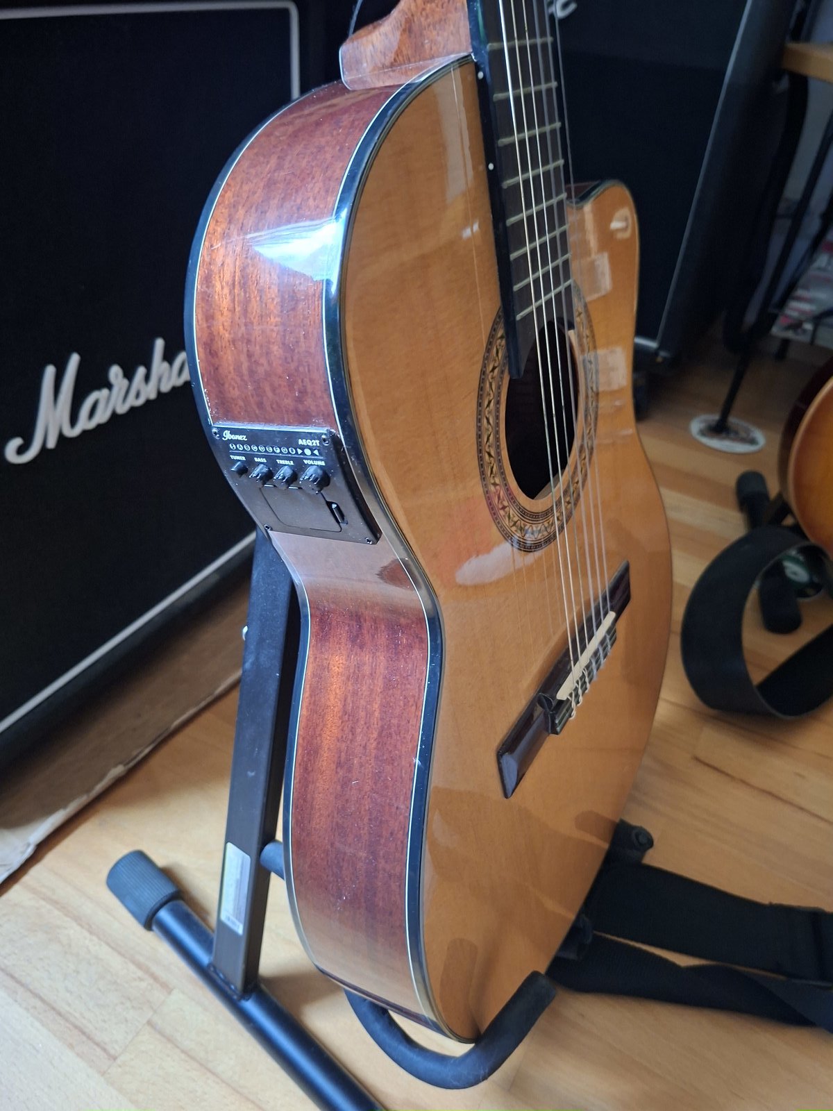 Model: IBANEZ GA5TCE-AM Vaan ei ole nailonnypläily sittenkään oma juttu. Myyntiin siis kuvan siisti kuntoinen keppi. Ollut meikäläisellä alusta kesästä 2020 asti Pehmeä keikkalaukku kuuluu kauppaan. Lähetys onnistuu siinä tarvittaessa, mutta ehkä pahviboxi tarvitaan. Kulut tällöin ostajalle. So it appears nylon strings were - again - not my cup of tea, hence shall put on sale - from the 1st owner - the attached mint beauty. Soft gig bag included. Delivery possible within this, but may need supportive box. Small cost added on the final price tag though. Fan! Återigen hände det att nylon strings är inte min grej, därför säljats (från förstä ägaren) mint cond electro acoustic. Kommer med sin egen soft gigbag. Specs: Body: spruce 3/4-size, 590mm/23.2" scale Body/waist: Sapele Neck: Okoume 18 frets fretboard and bridge: Purpleheart inbuilt microphone and tuner preamp: Ibanez AEQ-2T preamp (1x 9V battery) Hinta: 230 € | |