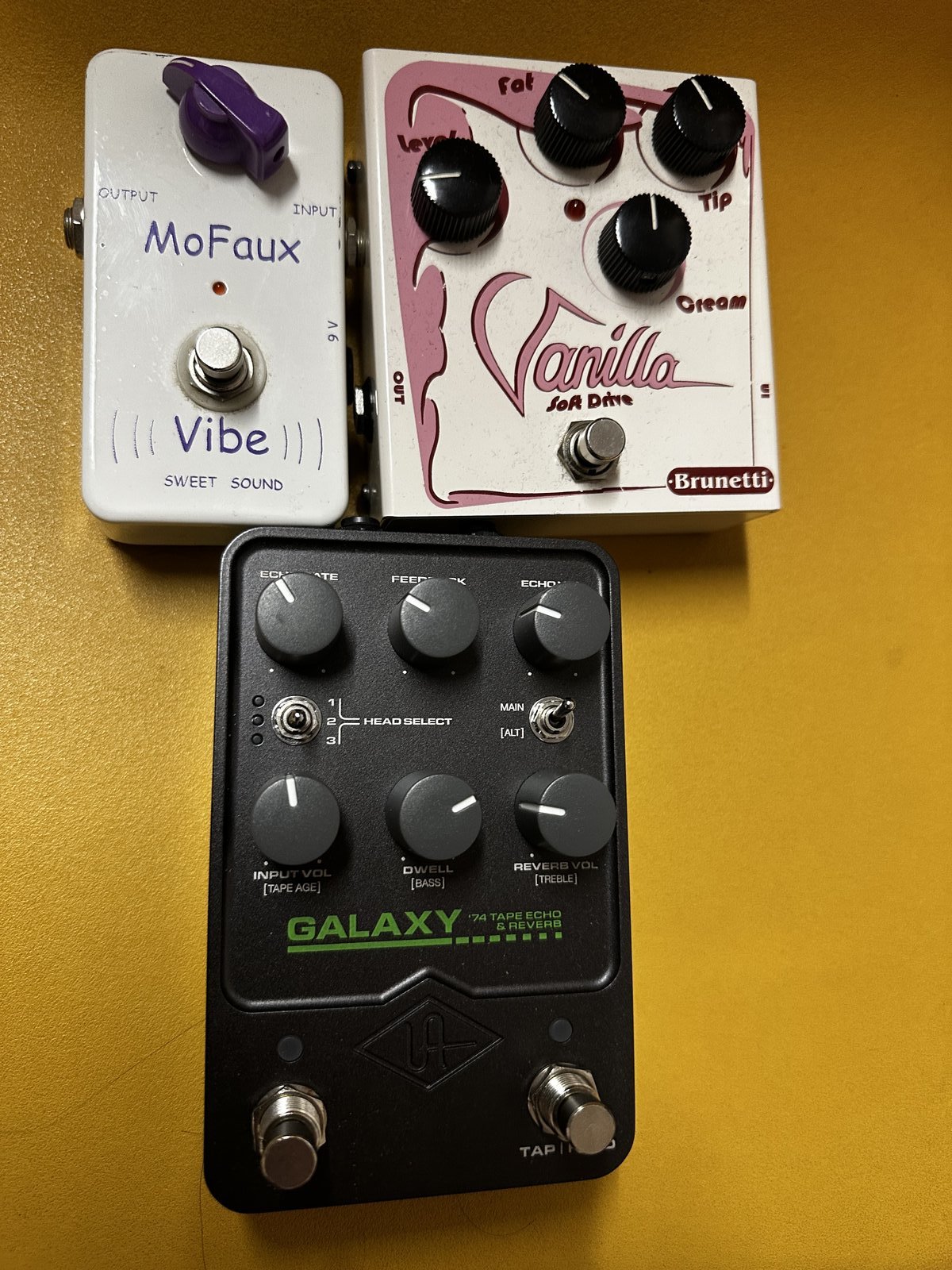 | -Universal Audio Galaxy '74 Tape echo & reverb MYYTY!! UA:n versio kyseisestä aihiosta. Aivan huikeasaundinen laite. Apin avulla saa modattua laitteeseen vielä extra toimintoja. Pedaalilauta ystävällinen koko! Uuden veroinen ja laatikko mukaan. Mahdollisuus ostaa myös Voodoo Labin current doubler-piuha, jolla saa tähän esim PedalPower2+:sta riittävästi virtaa. Hinta 190¤ -Sweet Sound MoFaux vibe Erittäin hyvä ja suht harvinainen Uni-Vibe pedaali. Tällä lähtee myös hyvät leslie saundit! Hinta 100¤ -Brunetti Vanilla Soft Drive Brunetti vahvistinverstaan low gainer overdrive. Kermaisen pehmeä saundi. Bass ja treble säädöt! Hinta 75¤ Ei vaihtoja. Postit neuvotellaan tapauskohtaisesti. Hinta: 75 € | |