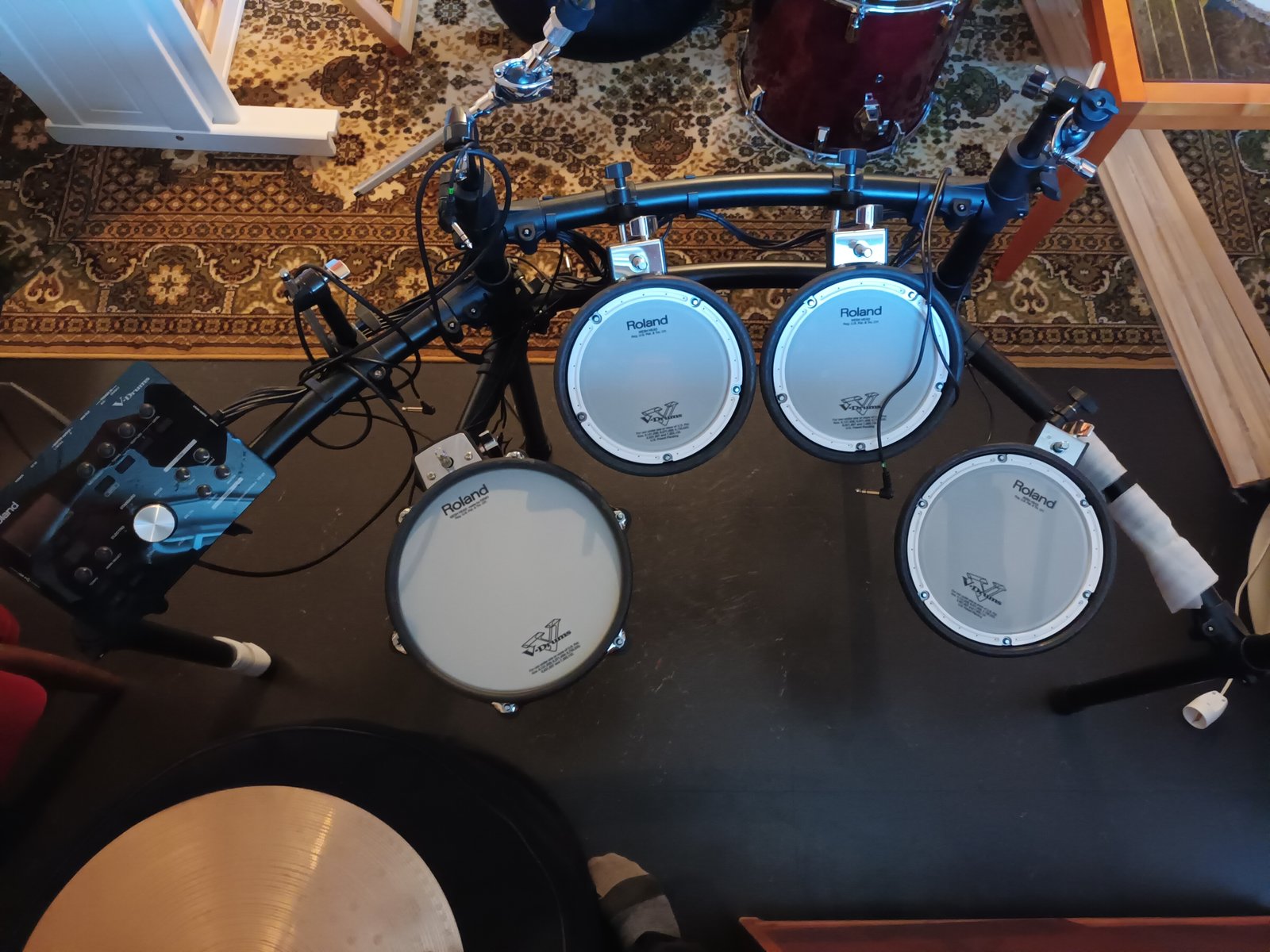Uudenveroinen Roland td-25k sähkörumpusetti. Hyvin vähällä käytöllä ollut. TD-25 Äänimoduuli. 1 kpl PDX-100 10-inch mesh-head snare pad 2 kpl PDX-6 6.5-inch pads for rack toms 1 kpl PDX-8 8-inch pad for floor tom 1 kpl VH-11 V-Hi-Hat 1 kpl CY-12C 12-inch crash cymbal 1 kpl CY-13R 13-inch ride cymbal KD-9 kick pad Roland räkki ja ohjekirja. Mielellään nouto. Lähetys myös onnistuu jolloin rahtikulut lisätään. Voin myös toimittaa lähialueella. Hinta: 1400 € | |