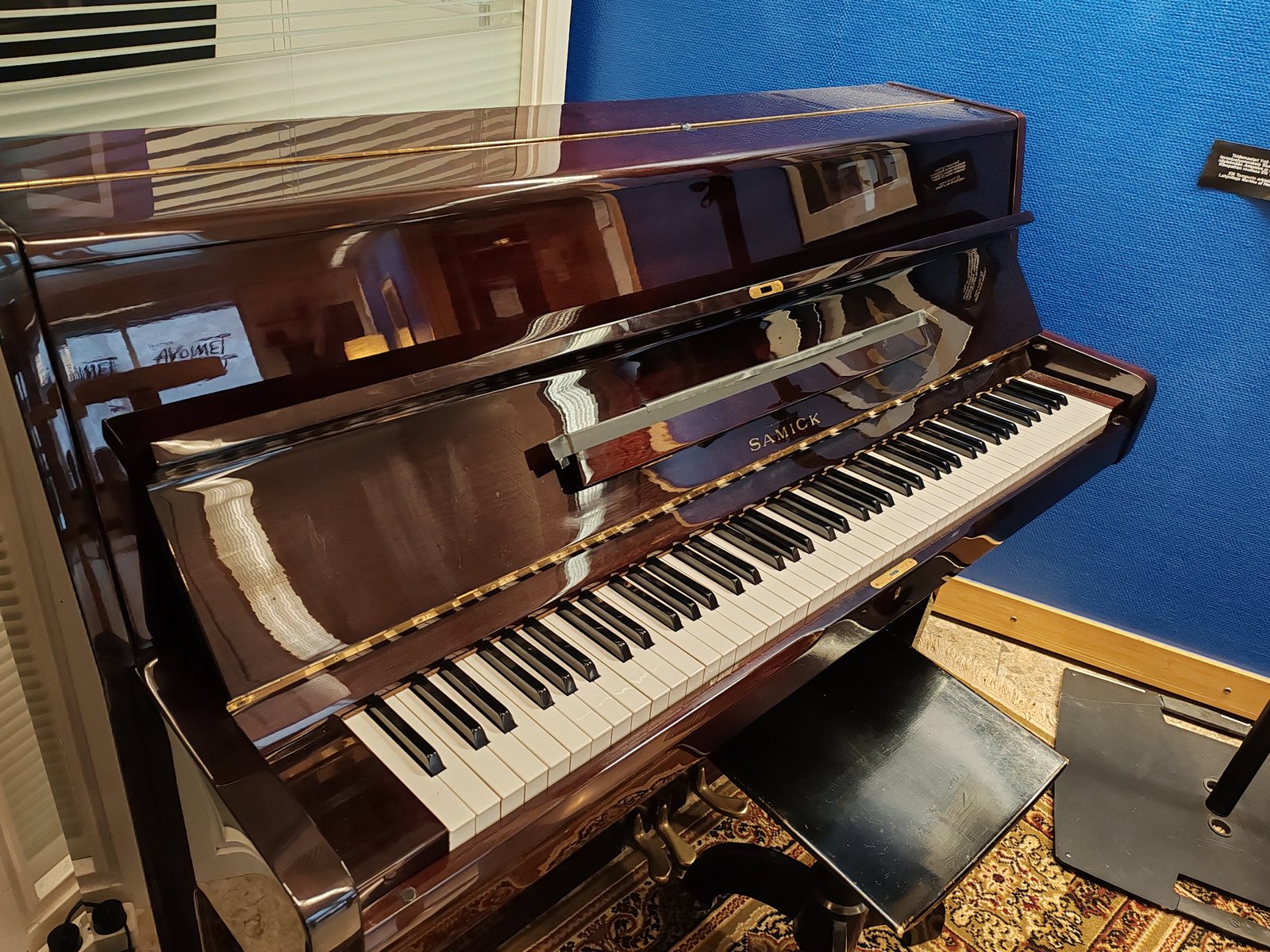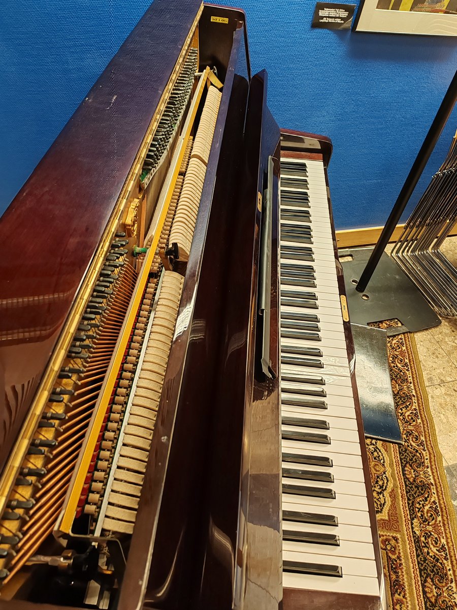 Myydään Samick-merkkinen akustinen piano teatterimme muuton vuoksi. Soitin on vuodelta 1982 ja on hyvässä kunnossa. Tuoli annetaan kaupan päälle. Piano viritetty viimeksi maaliskuussa 2025. Mahonki, kiiltävä, kork. 107 cm, lev. 147 cm, syv. 60 cm. Paino 198 kg. Tervetuloa koesoittamaan pianoa! Pianosta voi myös tehdä tarjouksen. Hinta: 500 € | |