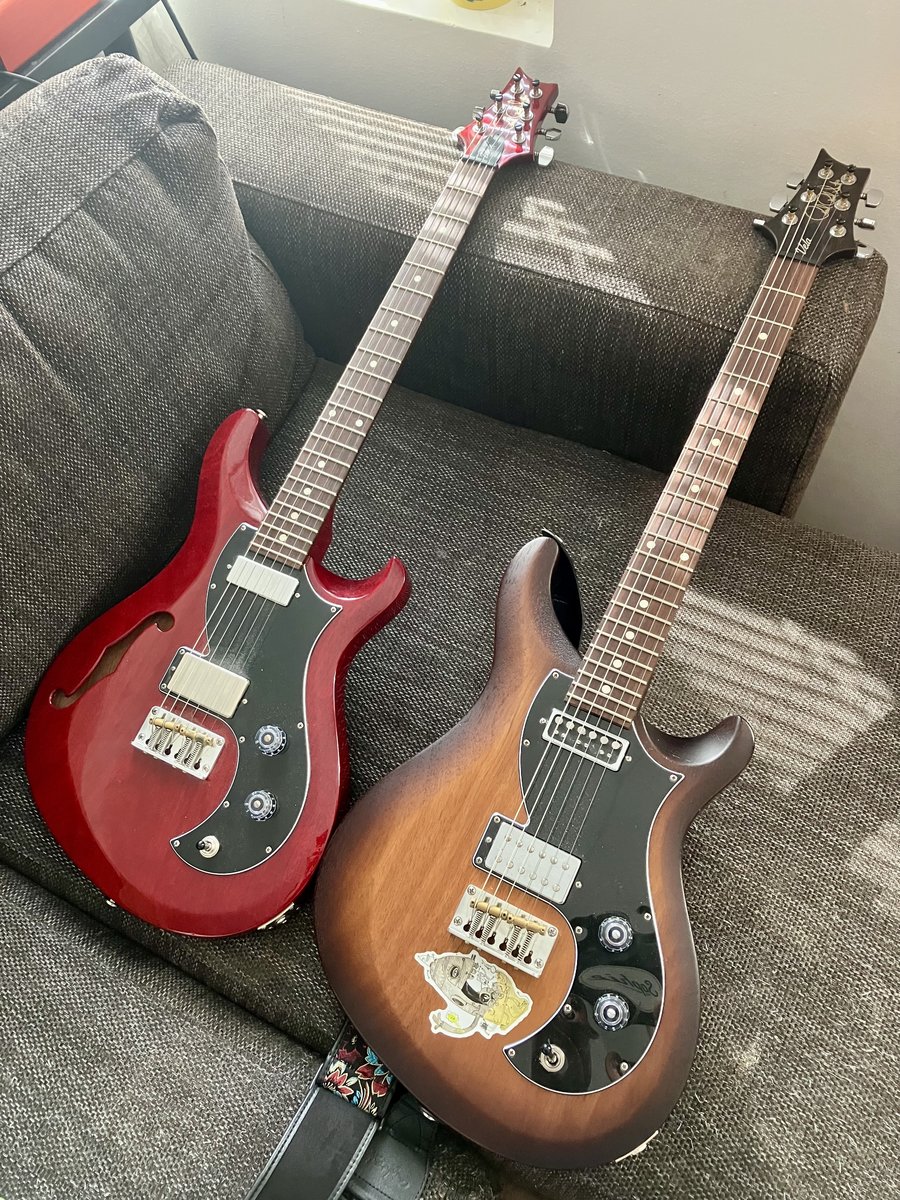 Eli toinen PRS Vela vois vaihtua saman hintaluokan teleen, stratoon tai jazzmasteriin, missä ruusupuuotelauta. Muutakin saa ehdottaa. Katotaan innostaako. Toi satin malli ois se minkä päällimmäisenä voisin vaihtoo / myydä, mut jos oikein hyvä tarjous tulee vastaan, niin harkitsen myös tuota semihollown vaihtoa. Näistä toi satin viimeistelty malli oli uutena jotain puolentoista tonnin luokkaa ja semihollow vähän enemmän (plus siihen vaihdettu Lollar Firebird mikit ja CTS sähköt). Vaihtoarvo sen mukaan. Tuon tobaccoburst satin viimeistellyn Velan voin myös mahdollisesta myydä. Hintaa 1000¤. Ostin näitä aikanaan kaksi uutena, kun oli tarve kevyelle helpposoittoiselle kitaralle (tenniskyynärpää ja niskavaivoja). Nää on ergonomialtaan parhaita kitaroita mitä on olemassa ja soundit myös kohillaan! Kevyt kitara. Painoa jotain hivenen yli 2,5kg. Tällä voi soittaa helposti usean tunnin sessiot, eikä tunnu missään. Roikkuu kaulassa samaan tyyliin ku stratot, mut paljon kevyempi ja soittotatsi myös kevyempi. Soundista ja muusta arviota alla: https://www.premierguitar.com/gear/prs-s2-vela-review | |