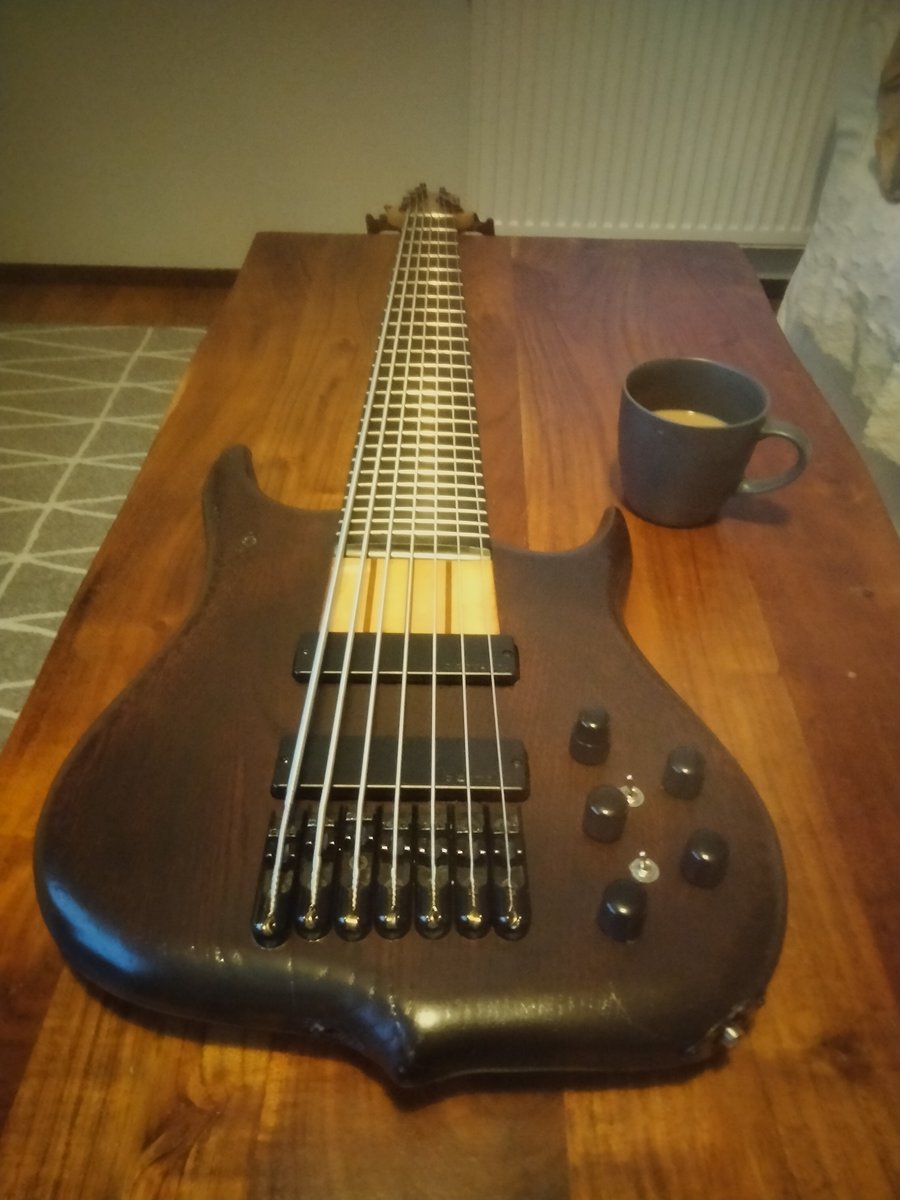 Tollanen itse kyhäämä 7-kielinen mörköbasso kaupan. Body yhestä tammi palikasta jyrsitty, sähköt ja kaula wolfin tekemät. Mikit bartolinit Todella pitkä sustaini, soundi modernin tyylinen mut saa myös passiivilla vähä pehmeämmäksi. Kaula hyvä ja suora. 3 alue ecu, mute ja aktiivi/passiivi kytkimet. Kaula pulteilla ja liimalla kiinni, irroitettavissa mutta vaatii toimenpiteitä. Viimeistely ei paras mahdollinen mutta sointi ja sustaini on. Kiinteeksi asennetut dunlopin straplockit, levee nahkainen hihna mukaan missä myös lukot. Vireys F#, H, E, A, D, G, C Yyveella aluksi. Vaihto vain rahaan. Jos hinta ei miellytä nii tarjoa. Lähetys onnistuu ostajan piikkiin matkiksella hyvin pakattuna, aina toiminu homma matkiksen kanssa Hinta: 380 € | |