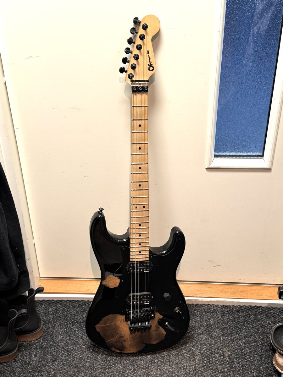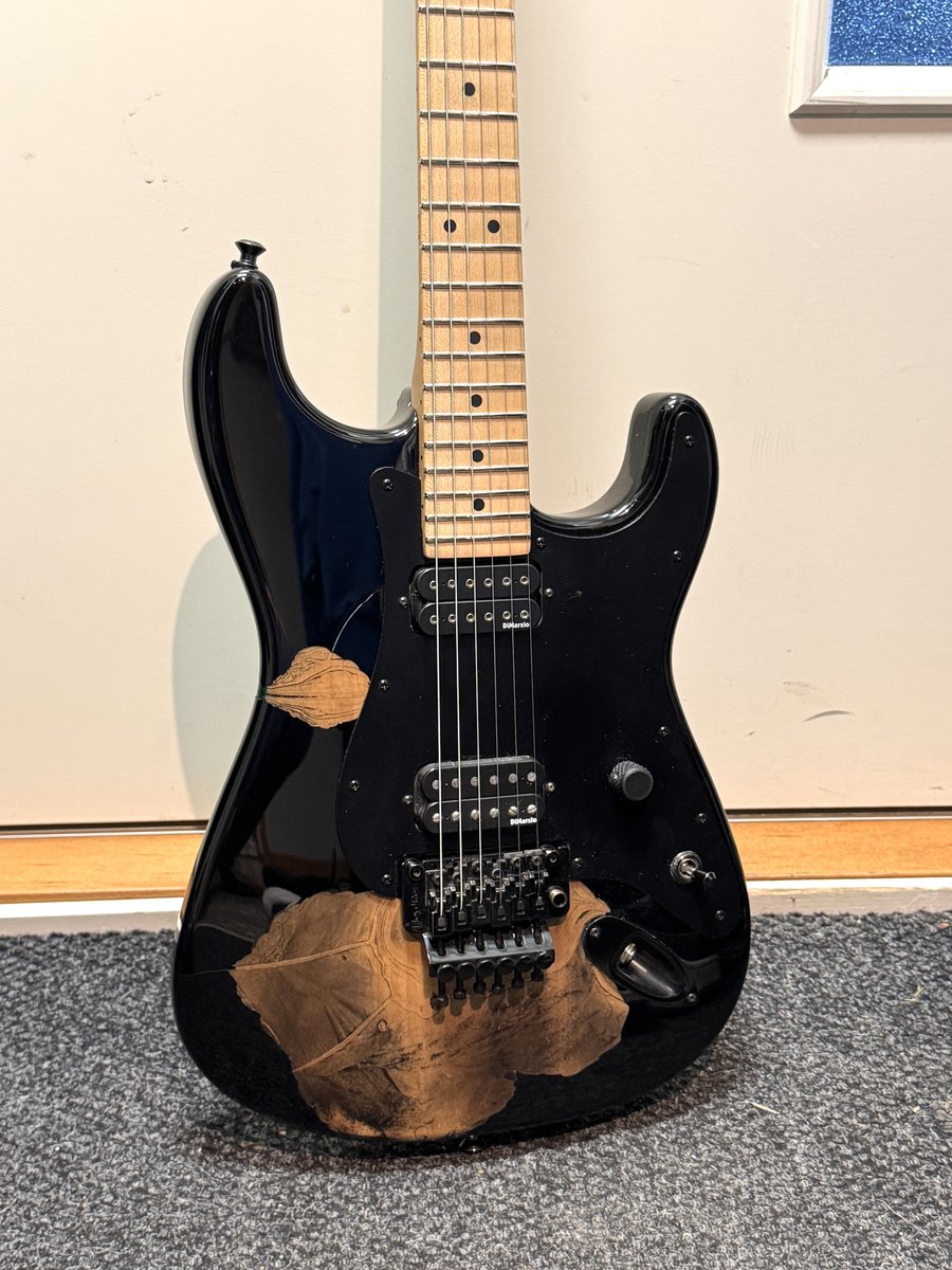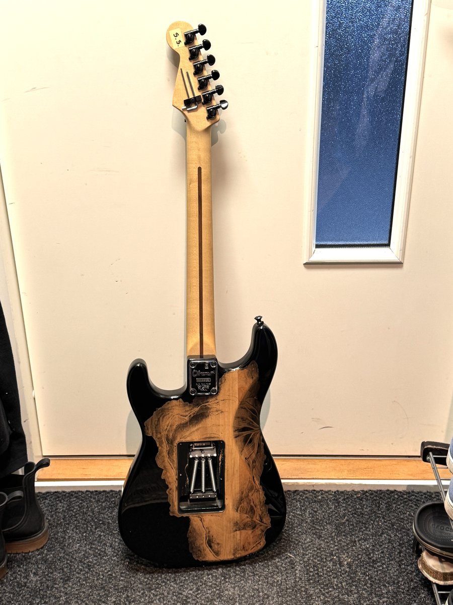 Loistava ja monipuolinen, hyvää vuosikertaa oleva rokkikeppi etsii uutta omistajaa. No koska minulla on näitä kaksi ja toinen joutaa nyt mennä. Vaikka siihen on juuri laitettu rosterinauhat TW Custom Guitarsin toimesta. Kitarassa on orkkismikit, eli Tone Zone tallassa ja Evolution kaulamikkinä. Maali on vuosien varrella karissut osittain pois. Ei siis refin. Alla kiiltävä primer. Dunlop-hihnalukot ja Floyd Rose. Mitä muuta tarvitaan? Laukku. Mukaan moitteeton Charvel- kova laukku. Näitä ei paljoa liiku. Erittäin hyvä soittaa ja soundaa mahtavalta. Kitara Vantaalla, lähetys ostajan piikkiin. Tule ja puserra! Hinta: 1100 € | |
