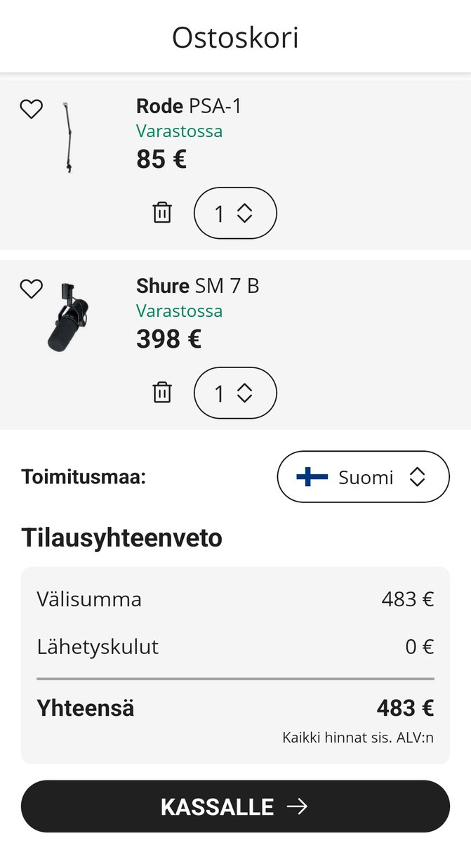Nopeilla kaupoilla edullisesti ammattitason mikkisetti. Eli mukaan siis Vähän käytetty Shure Sm7b mikrofoni sekä Rode Psa-1 mikketeline. Mukaan tulee myös xlr johto. Näiden ovh. Thomannilla ~500. Jyväskylä nouto tai rahat tilille ja postiin. Myynnissä vain perjantaihin asti! Hinta: 330 € | |
