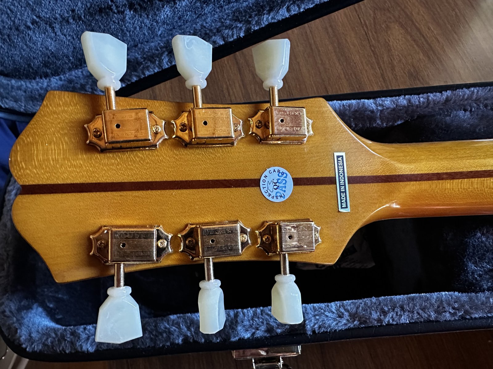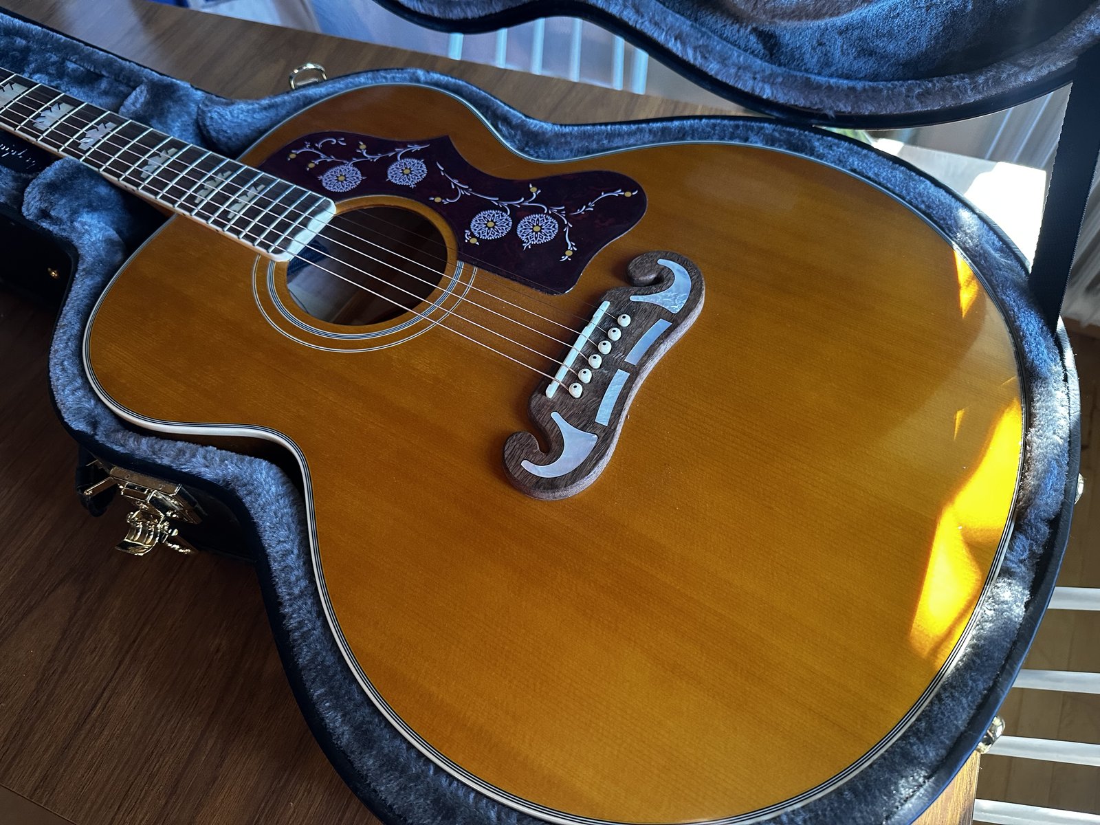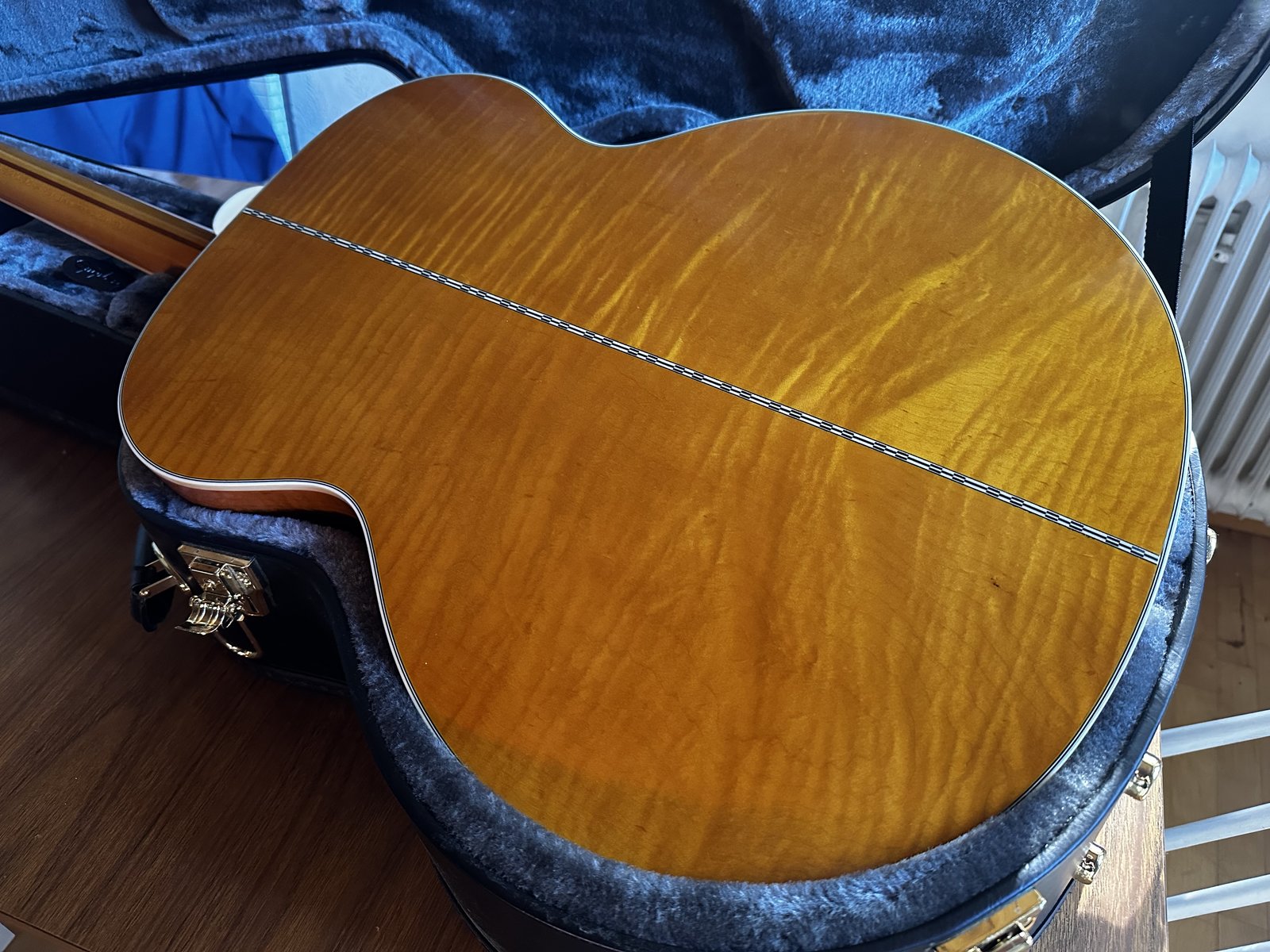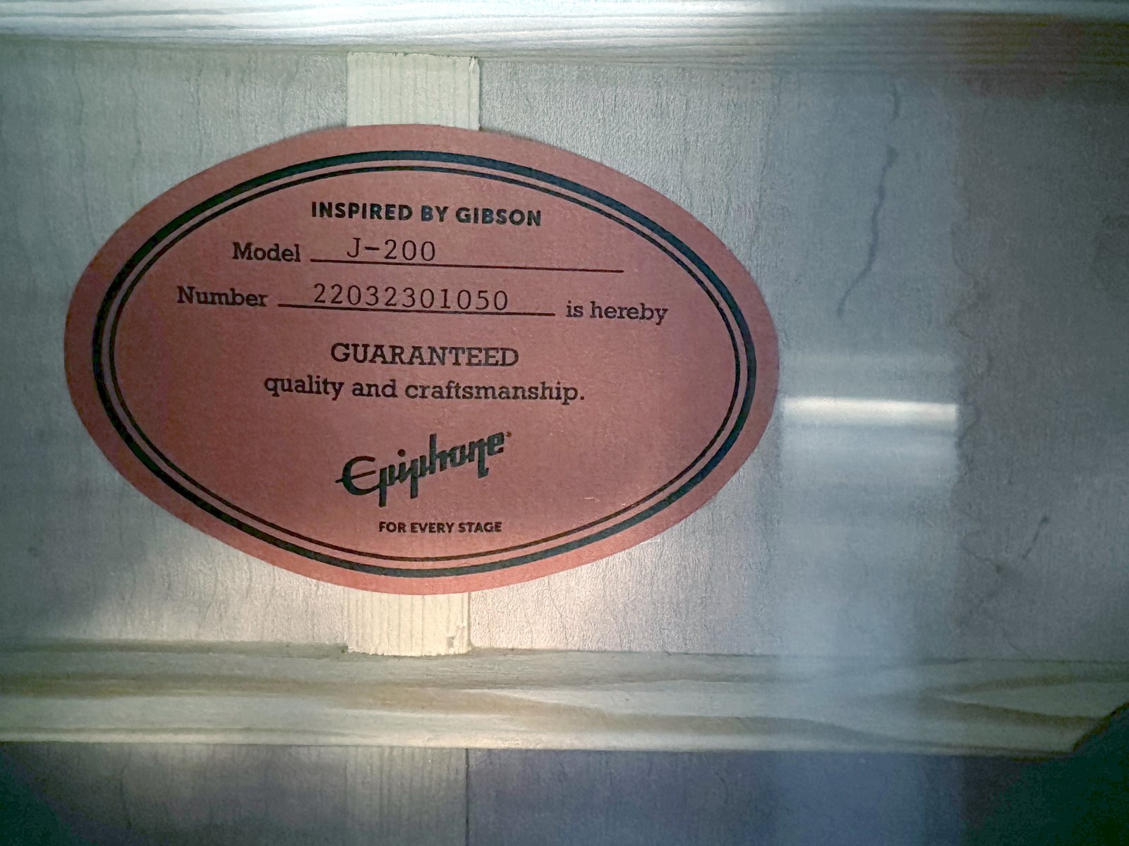 Vuonna 2021 ostettu, uudenveroinen Epiphone J-200 Masterbilt alkuperäisellä Epiphonen kovalla kotelolla. Kaunis kuin mikä, ja soi hienosti - ei vaan ole ollut aikaa/innostusta soittamiseen ja nyt ollut vain keräämässä pölyä viimeiset pari vuotta. Säilytetty aina omassa kotelossaan. Indonesiassa tehty malli. Kuittikin löytyy, maksanut yhteensä 1066e uutena. Sijaitsee Turussa, kulkeutuu Tku-Hki välillä myös tarvittaessa. Ostajan vastuulla myös Matkahuolto mahdollinen. Ei vaihtoja. https://reverb.com/en-fi/item/72036 … ne-j-200-aged-natural-antique-gloss Speksit: Design: Super jumbo Top: Solid sitka spruce Back & Sides: Solid flamed maple 2-Piece neck: Maple with mahogany centre strip Fretboard: Indian laurel Fretboard inlays: Mother-of-pearl graduated crowns Back with centre strip 6-Ply top binding 4-Ply back binding Neck profile: Rounded C Scale: 649 mm (25.551") Nut width: 43 mm (1.693") Nut: Bone 20 Frets Pickup system: Fishman Sonicore with controls for volume and tone in the sound hole Bridge: J-200 Moustache Machine heads: Gold Epiphone Deluxe with Keystone buttons Colour: Aged Antique Natural High-Gloss Hinta: 900 € | |