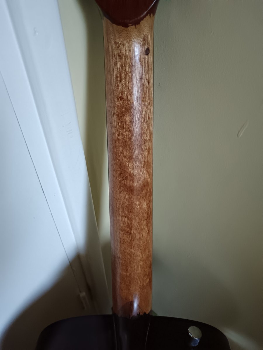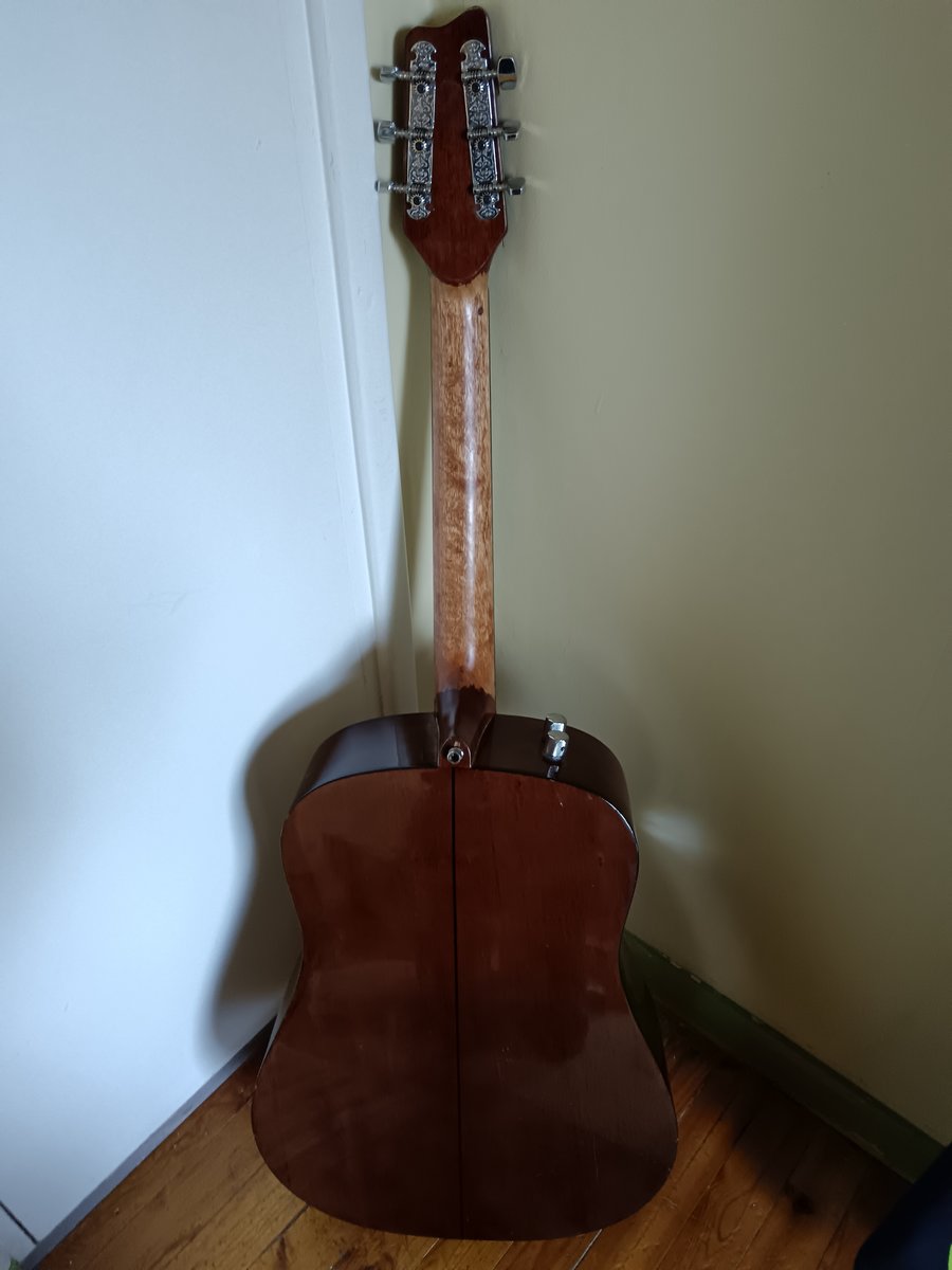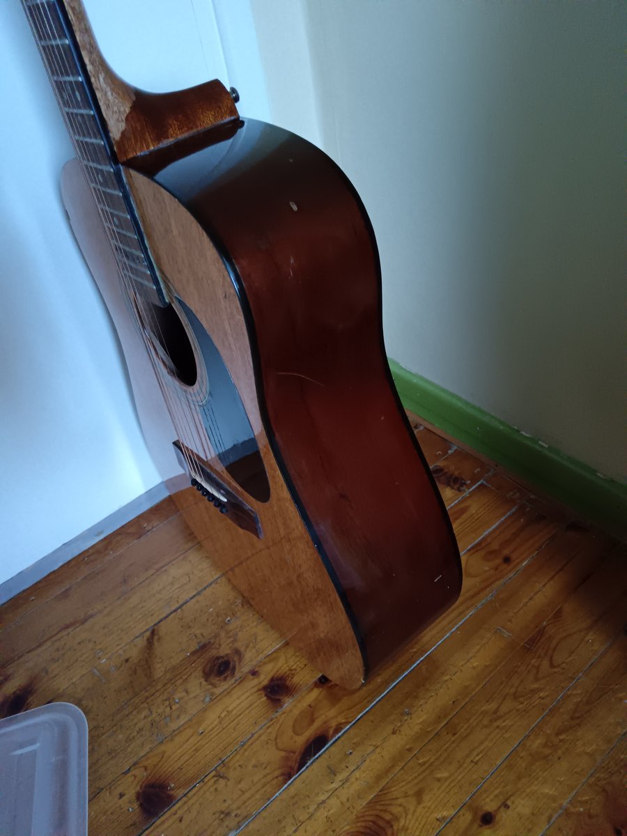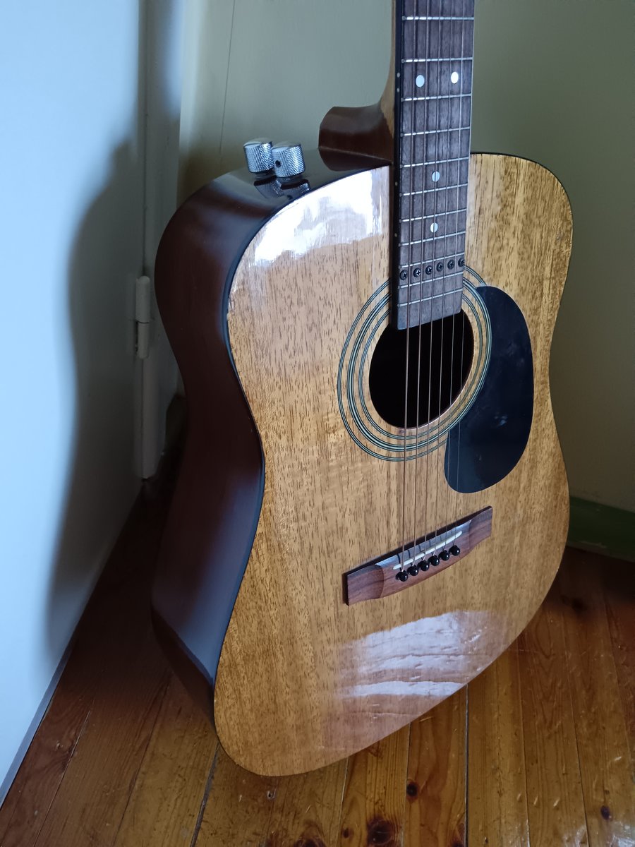 Samick LW-015 GE elektroakustinen kitara. Samickin mikkisysteemin ansiosta todella kuulostaa vahvistetulta akustisella. Volume ja tonepotikat toimii kuten kuuluukin. Todellä pehmeä ja lämmin soundi. Kaula hiottu asianmukaisesti puulle ja öljytty. Nyt on hyvä soittotuntuma ja liukas kaula. Lakkakaula kun tuppaa olemaan joskus aika tahmea. Muutamia pikku lommoja ajan saatossa on tullut, mutta yleisilme siisti. Alkaa olla soittimia jo paikat pullollaan niin jostain täytyy alkaa luopumaan. Hinta: 120 € | |