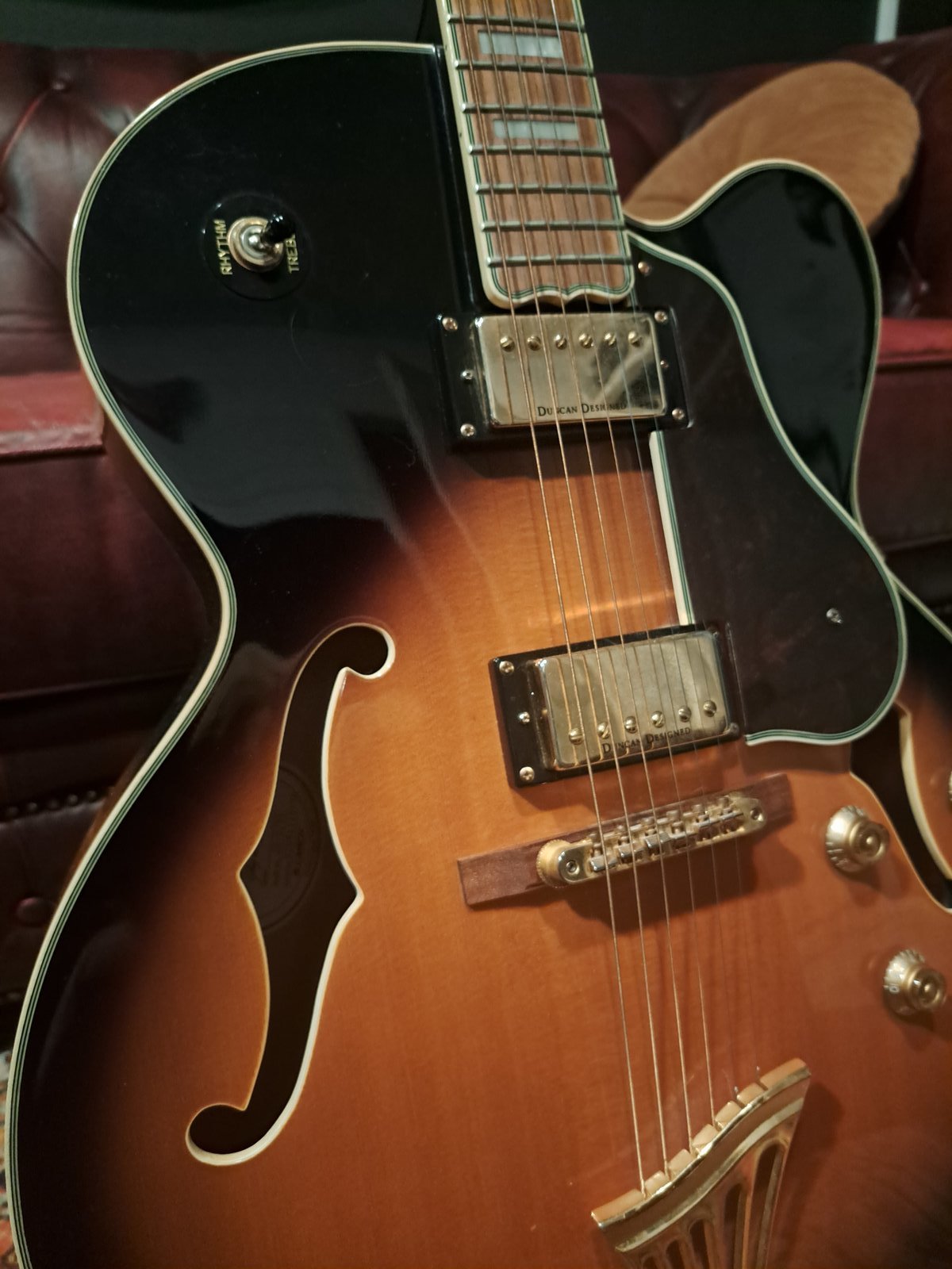 Tällainen Hollow Body Jazz kitara ylimääräsenä. Kaunis soitin ja upea classic sunburst väritys. En ole varma osastosta, mutta eiköhän tämä sähkökitarara ole enemmän kun akustinen Sopii hyvin Jazz, Blues ym. hommiin ja hinta/laatu suhteeltaan erittäin kehuttu soitin. Akustisestikin kova saundi ison bobyn myötä. Itse en ole varsinaisesti kitaristi, joten ehkä tiedät paremmin kun tulet testaamaan. Mielestäni hyväkuntoinen, ei naarmuja tai kolhuja. Alkuperäiset Duncan Designed mikit Hinta: 380 € | |