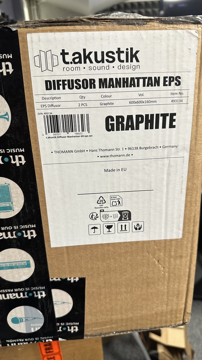 MYYDÄÄN t.akustik Diffusor Manhattan GR eps setti. Tämä "Manhattan skyline" - design diffuusori jäi ylimääräisenä studiorempan jäljiltä. Käyttämätön setti, täysin uusi, tehtaan paketissa. (Uutena T-kaupasta 93,90¤) Myydään firmasta, eli ALV mukana ja myyntilasku mukaan. MYYNTIHINTA: 75 ¤ (sis. 25.5% ALV) Helppo nouto Helsingin Punavuoresta. SPEKIT: - Valmistettu kovetetusta EPS-vaahdosta - Ääniheijastusten ja huoneakustiikan optimointiin - Sopii äänitysstudioille, radioasemille, kotiäänityksiin ja hifi-huoneisiin - Tehokas alue: noin 900–3 250 Hz - Helppo koota ja purkaa - Mitat: 600 x 600 x 150 mm - Laatikko sisältää 2 yksikköä pakkauskokonaisuuden, joka sisältää kokoamisohjeet - Yksi pakkaus sisältää 13 yksittäistä elementtiä - Väri: Grafiitti (harmaa) Hinta: 75 € | |