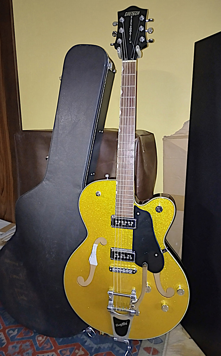 IT'S SHOWTIME ! Katseita keräävä Gold Sparcle Gretsch G5128 puoliakustinen made in Korea 2005. Näyttää, kuulostaa ja tuntuu erinomaiselta. Kaikki toimii, ei lommon lommoa, ei vähäistäkään. Kopan paksuus 62mm, DeArmond 2000-mikit. Oeschin hienosäädöt, kuten ainoa ei-alkuperäisosa kiinteäksi asentama rullatalla. Mukaan kova Rockcase-laukku, avaimetkin tallella sekä Chet Atkins-tyylinen vibrakampi. Tarjouksenkin voi esittää, mutta vaihtoja on jo kertynyt myytäväksi asti. Testit ja nouto Kalliosta, lähetys on neuvoteltavissa. Kontaktit ark. 16 jälkeen, vl. vapaammin. Txt/gsm tavoittaa parhaiten. Yhteydet näkyy profiilissa kirjautuneille. Muutakin äänekästä rompetta kotisivun linkissä. Hinta: 650 € | |