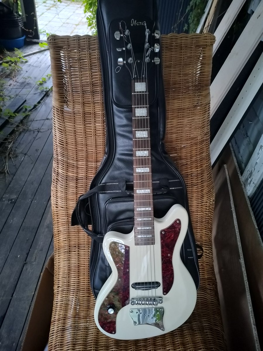 Omar Rodriquez-Lopezin nimikkomalli. Lyhytskaalainen 24" soitin. Kitaran rungossa ruma kolhu. Toimiva kitara, mutta hieman erikoinen soittaa johtuen pienestä koosta ja säätö mahdollisuuksien vähäisyydestä. Laukku tulee mukaan. Postikulut hinnan päälle. Hinta: 225 € | |