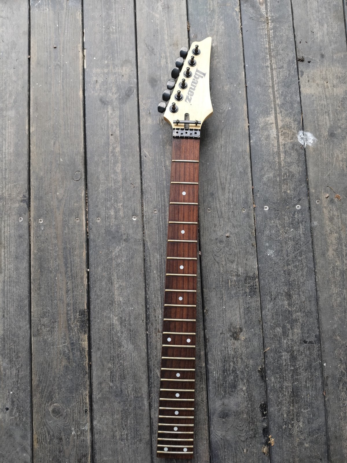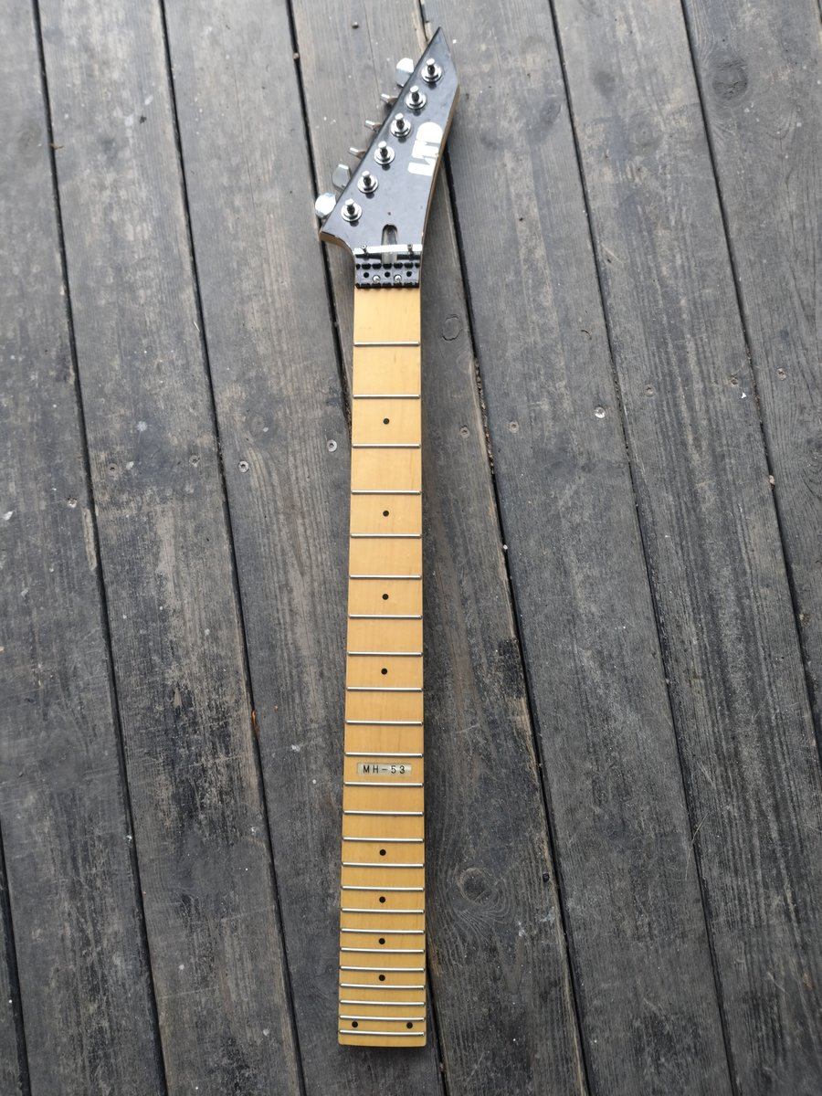 Ibanezin oikeakätinen kaula. Hieman näkyvää kulumaa nauhoissa. Kaulan kiinnityskohdassa ollut myös halkeama joka liimattu ja vahvistettu ruuvilla joka vuosia pysynyt hyvin kasassa. Hiottu, öljytty ja varattu pari vuotta sitten. Ollut myös vasenkätisessä rungossa kiinni ja lavassa sen myötä itse tehty dekaali eli jos laitat oikean kätiseen runkoon niin logo on sitten väärinpäin. 30¤ LTD oikeakätinen kaula. Hyväkuntoiset jumbonauhat ja muutenkin siistin oloinen vaikka käytetty tietysti on. 30¤ Postikulut päälle Hinta: 30 € | |