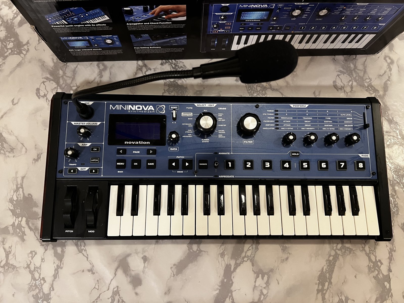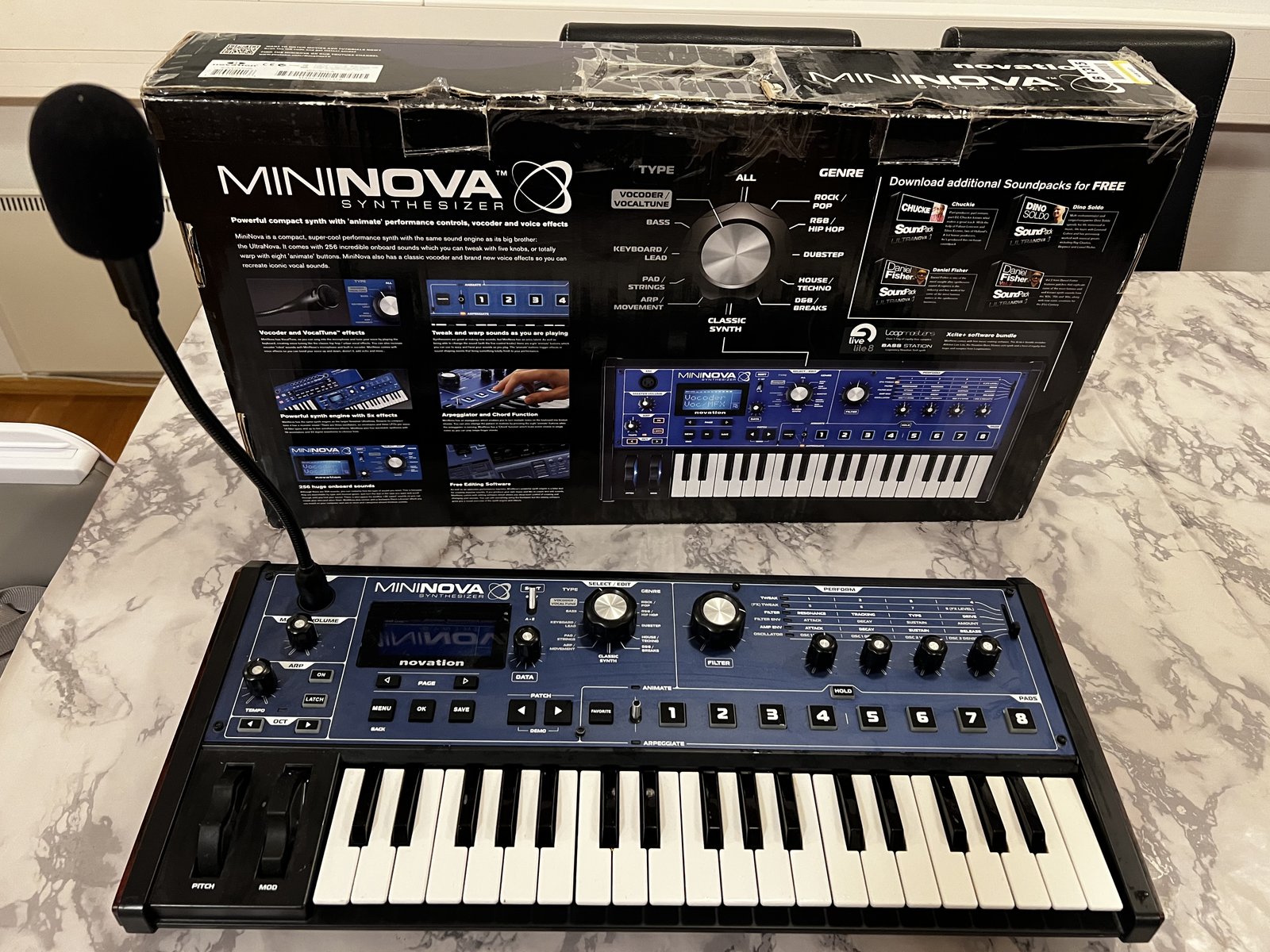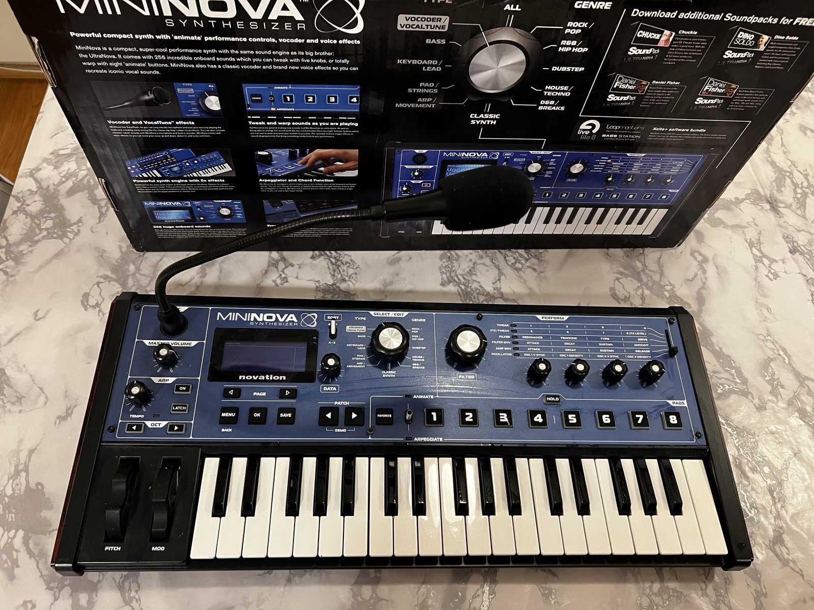 Novation Mininova on 37-näppäiminen syntetisaattori, jonka väri on sininen. Siinä on useita säätimiä ja näyttö, ja mukana tulee mikrofoni. Laite soveltuu musiikin tuotantoon ja live-esityksiin. Sitä on käytetty hyvin vähän ja vain kotona. Myyn sen, koska en enää tarvitse sitä. Jos pääsemme sopimukseen, voin tuoda sen pääkaupunkiseudulle Hinta: 250 € | |
