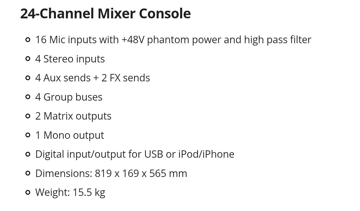 Myydään vähän käytetty 24-kanavainen Yamaha-mikseri ja keissi. On ollut vähäisessä bändi käytössä ja viime vuosina seissyt treenikämpässä. Mikseri on täysin virheetön. (T-kaupan hinta tällä hetkellä 1549¤). Loistava mikseri hyvillä efekteillä. 16 Mic inputs + 4 stereo inputs Katso speksit viimeisessä kuvassa tai tästä linkistä: https://www.thomann.de/fi/yamaha_mgp24x.htm Hinta: 590 € | |
