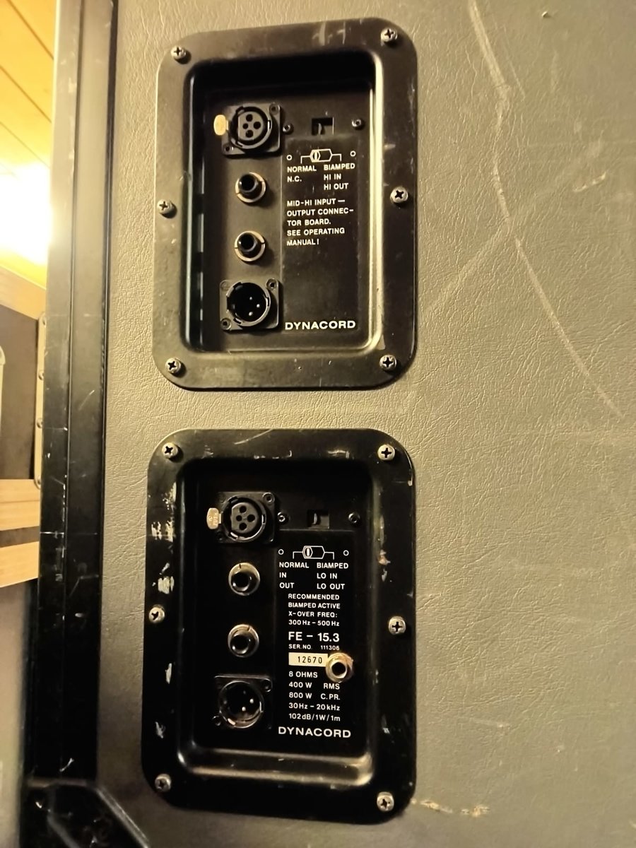 Aidot saksalaiset 90-luvun parhaimpia DYNACORD kaiuttimia. Kaapit ovat ns. fullrange. Basso elementti on ElectroVoice Proliner 15" ja keskialue 10" + driver, eli yhteensä 400W puhdasta ääntä. Varsinkin lauluääni tulee selkeästi läpi 10" kautta. Kaappi on ns. bi-amplified, eli voidaan jakaa Basso ja keskialueet erillisellä vahvistimella, joten ääni selkiintyy entisestään. Kaapit ovat olleet tanssiorkesterin eli kevyen musiikin käytössä. Koekuuntelu on mahdollista. Lisähinnalla (190¤) saadaan ECLER PAM 1000 eli 1000W:n vahvistin kaupan päälle. Kaapit voidaan toimittaa Turkuun ja sen lähialueella. Hinta: 450 € | |