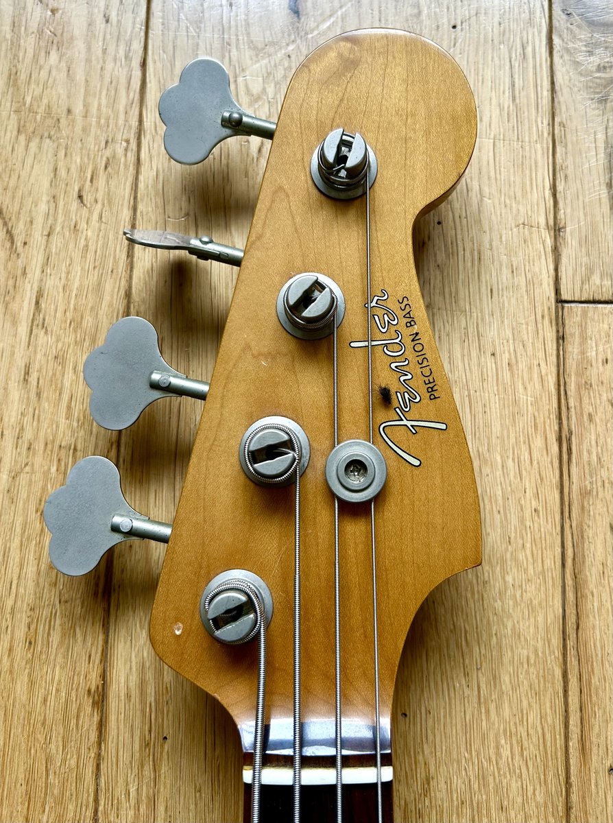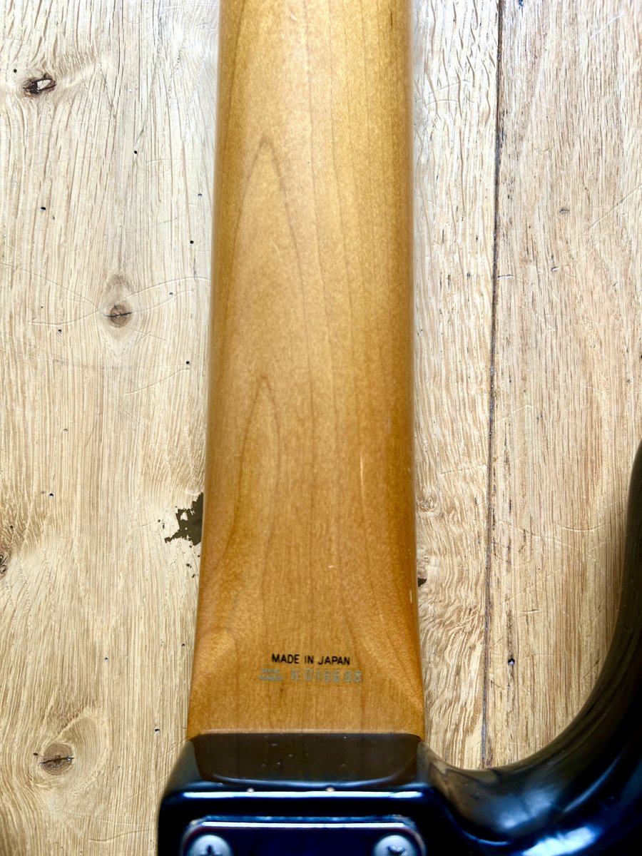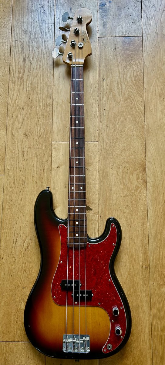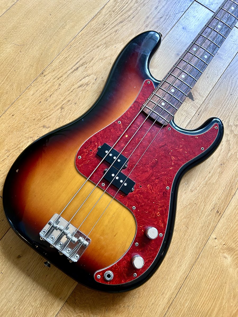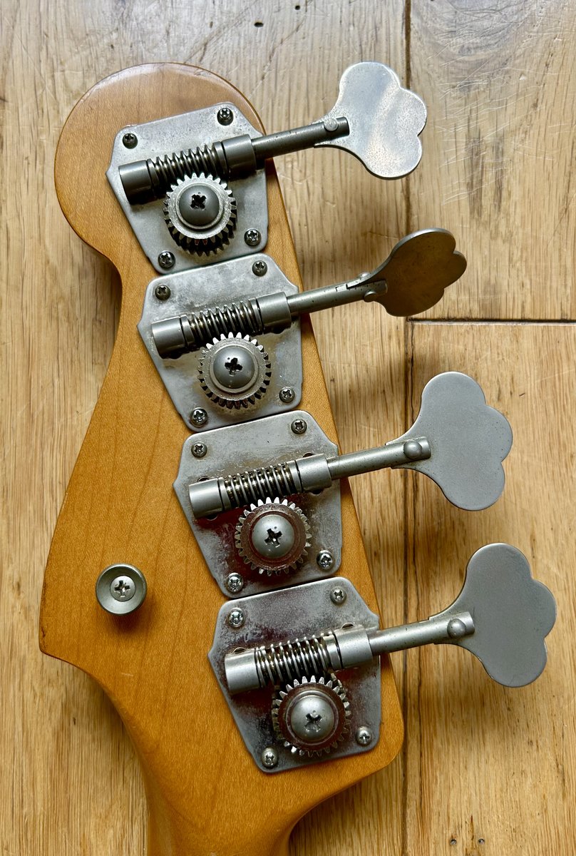 Fender Precision Bass ’62 Reissue — Made in Japan (FujiGen) Classic Fender P-Bass tone in a '62 reissue built at FujiGen. This example has all original parts, a beautiful sunburst finish with red pickguard, and the serial K016688. Neck date: 1988 (stamped) — Body date: 1990. FujiGen-built Fender Japan reissues from the late 1980s / early 1990s are known for very solid build quality and great P-bass tone. This instrument keeps original pickups, controls and tuners and sounds warm, balanced, and articulate in the classic P-bass range. Body: Alder Neck: Maple Fingerboard: Rosewood Scale length: 34" (standard Precision Bass) Frets: 20 Pickups: Original split-coil Precision pickup (passive) Electronics: Master volume, master tone (original pots) Hardware: Chrome, original tuners and bridge Color/finish: Sunburst Pickguard: Red Pearloid (original) Weight: ~4.2 kg Gigbag: included (non original) Playability & setup Fretboard and frets: Good / playable (no significant wear affecting tone) Neck relief: adjustable; truss rod functional Action: set to medium low Electronics: original split-coil pickup; pots and jack tested and working Hinta: 1280 € | |