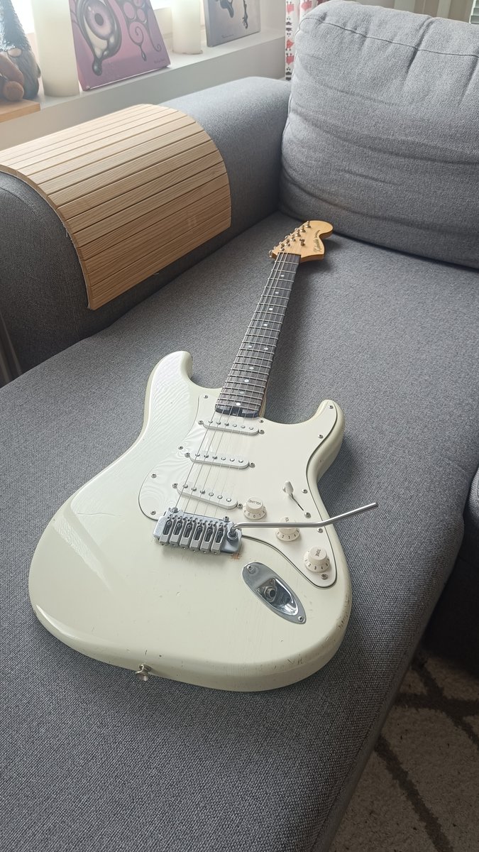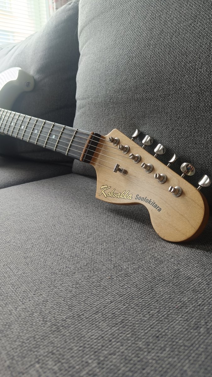 Tarjolla olisi tämmönen mielenkiintonen minulle vaihdossa tullut strato. Runko on leppää. Se on Hollantilaisen Haar Guitarsin stratorunko. Kaula on suomalaisen Kimmo Kohvakan tekemä. Otelauta on brasilialaista ruusupuuta. Otelaudan radius on 12". Kaula on tuhti ja sen profiili 5. nauhalta lapaa kohden muodostaa hennon V-muodon. Runko on nitrolakattu ja se näkyy soittimessa "relikoitumisena". Lakka on halkeillut hienosti ja ikääntyy soittajansa kanssa arvokkaasti, toivottavasti. Kolhuja on kertynyt, mutta sehän kuuluu asiaan. Nauhat on hyvässä kunnossa. Ei isompaa kulumaa ja niissä on vielä hyvin ikää jäljellä. Mikit on Dimarzio Area -setti. Keskimmäisen tonepotikan nostokytkimellä saat blendattua kaulamikin mukaan vaikka keski- ja tallamikin kanssa. Alin tonepotikka toimii mastertonena. Talla on Wilkinson. Mallista en ole ihan varma, mutta internetin perusteella luulisin että se on Wilkinson VS100N-HC. Pitää hienosti vireen vaikka vähän enemmänkin rääkkäis. Kuulostaa yllättäen aivan stratolta! Vaihdossa kävisi putkivahvistin. Esim. Deluxe reverb, Blues junior, Blues deluxe, Hot Rod deluxe, Bass Breaker yms... Voi toki tarjota kaikenlaista perinteikästä vahvaria. Cleanit edellä! Kaupat mielellään kasvotusten Helsingissä. Voin tarvittaessa tuoda myös uudellamaalla kohtuullisen matkan päähän :) Kitara sijaitsee Pitäjänmäellä. Hinta: 600 € | |