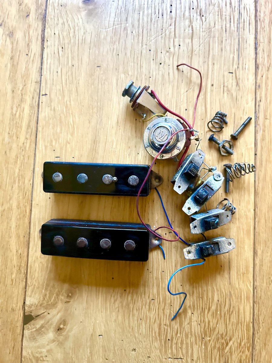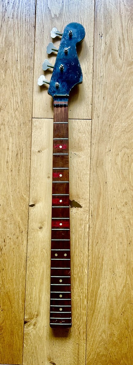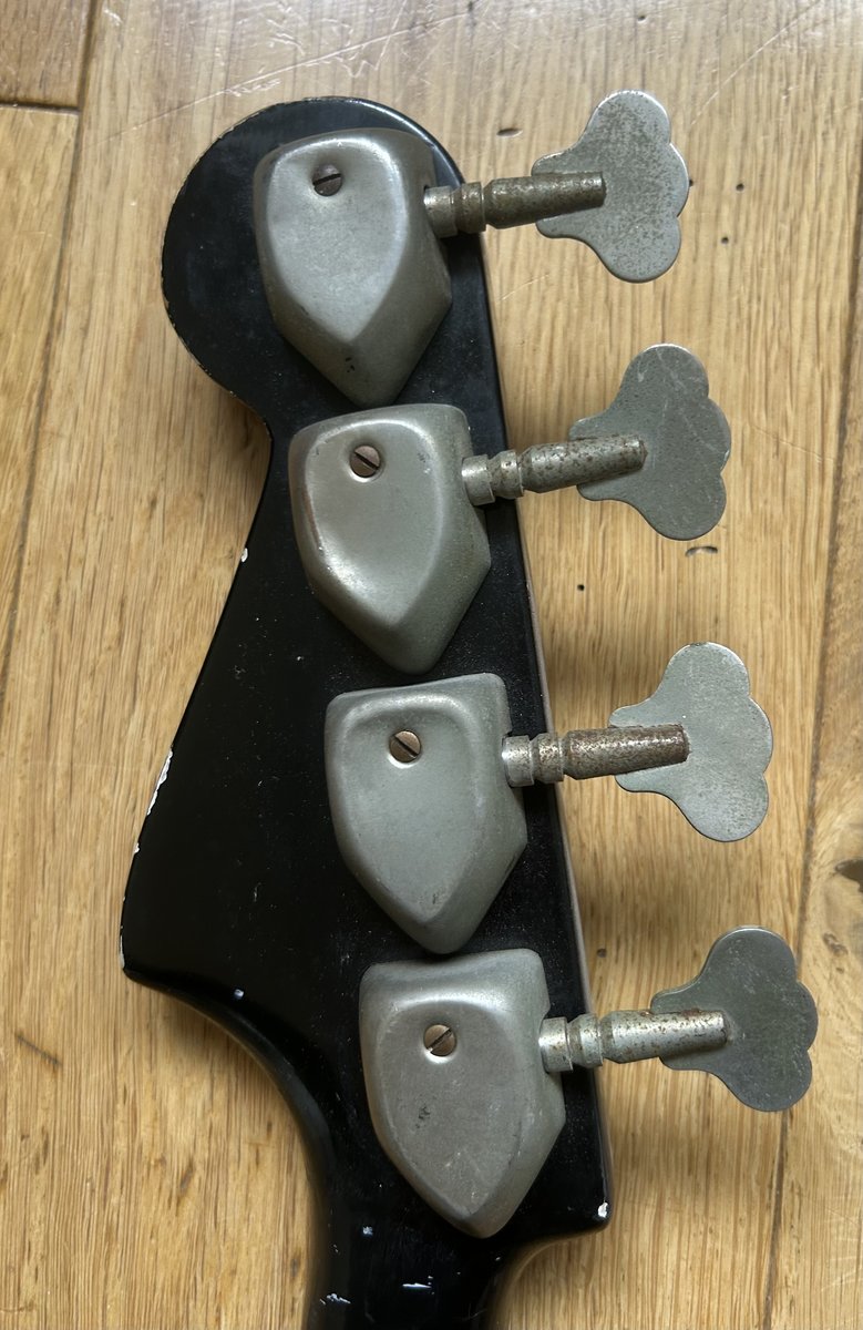 Model: Hagström Kent PB-24G, the “G” denoting guitar-style body with bass neck • Years: Produced 1963–1966 • Origin: Älvdalen, Sweden. • Scale length: Short scale (30”). Neck Tuners Body + acrylic body cover Picups and electronics Bridge (wooden saddle is missing) Original case Hinta: 180 € | |