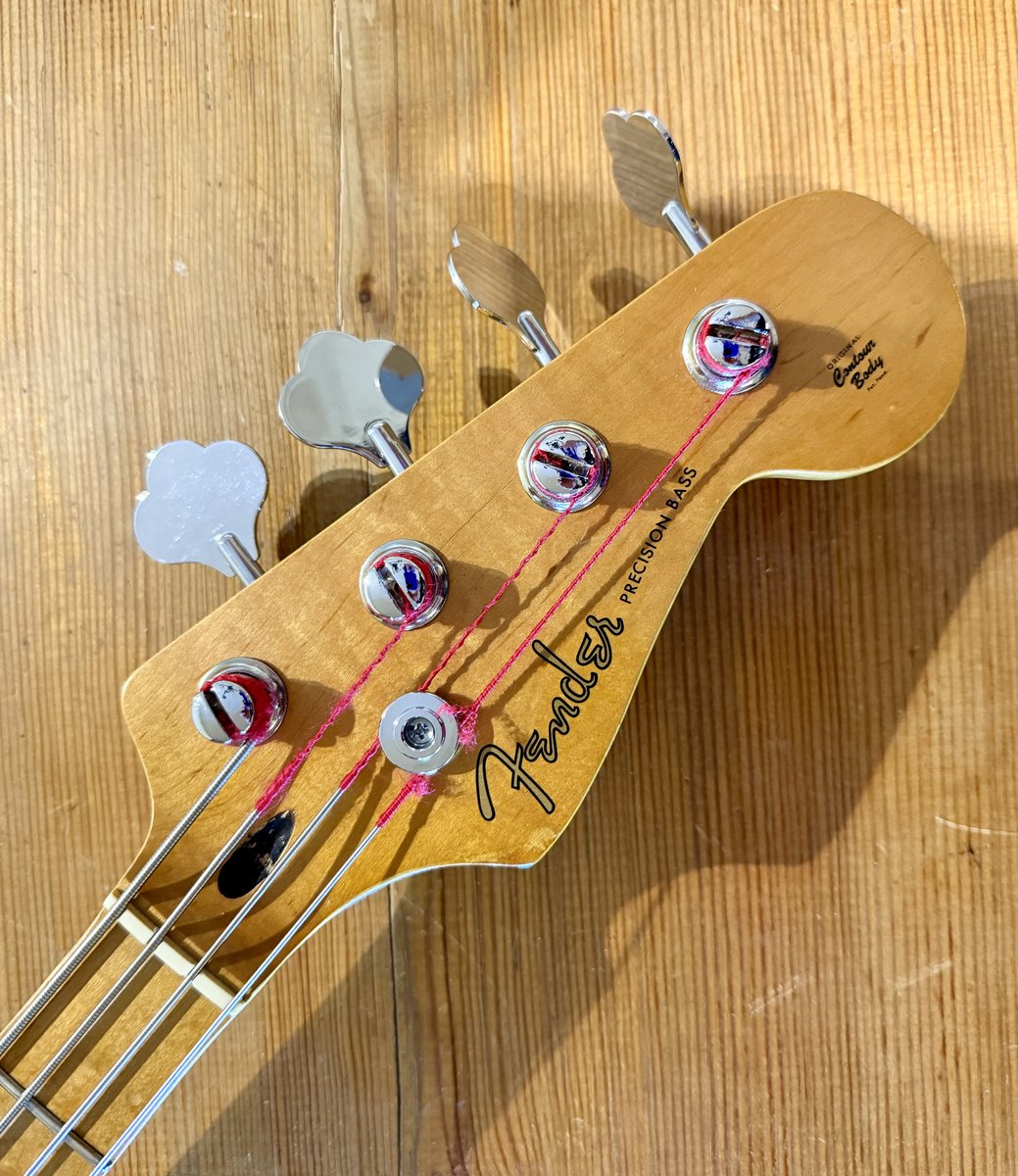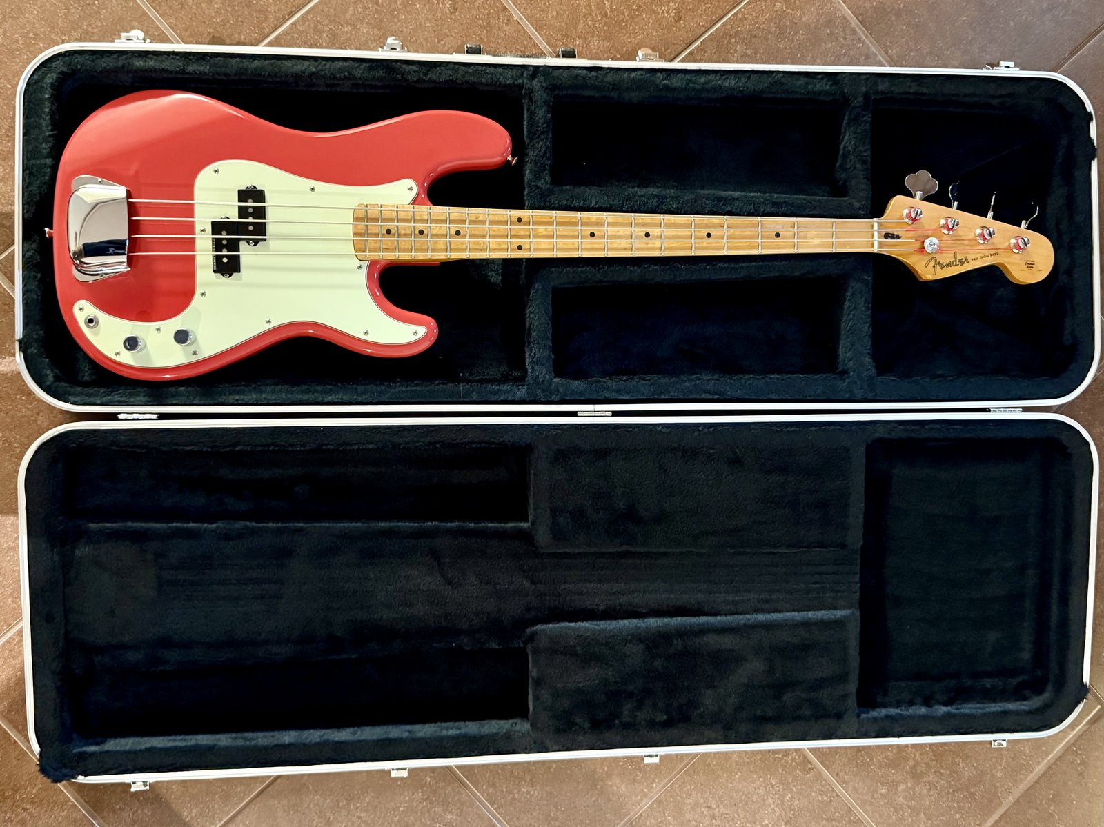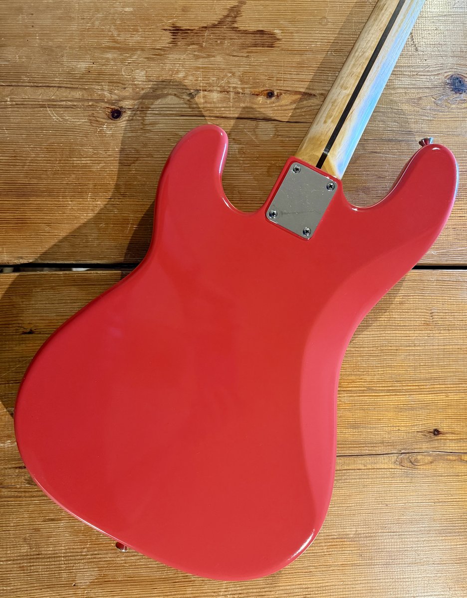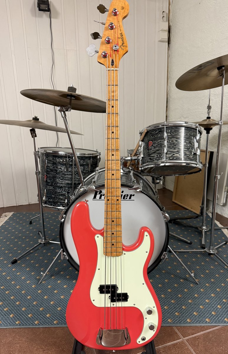 Oikein nätti ja hyväkuntoinen Fiesta Red Presari kaupan. Huom! Ei ole aito Fender vaan puhdas kopio! Basson on rakentanut rautalankapiireistäkin tunnettu Teuvo ”Teukka” Grönroos syyskuussa 2013. Kaula on vaahteraa ja sen on Grönroos itse valmistanut. Lakkaus on vintage vivahteinen ja olen kevyesti hionut taustapuolta. Kaula on profiililtaan Jazzbass tyylinen, eli hieman ohuempi ja kivan helpposoittoinen, ainakin minulle. Nauhat ovat hyvässä kunnossa. Kielinä uudehkot RotoSound Jazz Flatwoundit. Body on leiman mukaan Anderson Guitarworks (California, USA), lokakuussa vuonna 1988 valmistama, eli varsin laadukas. Mintgreen 3-kerros pleksi. Mikkeinä erinomainen Seymour Duncan II Basslines setti. Elektroniikasta en tarkemmin tiedä, mutta potikat ja jakki toimii moitteetta. Virityskoneisto ei ole ihan yhtä laadukas kuin muu basso, mutta soitin pitää kyllä vireen hyvin. Kauppahintaan kuuluu mukaan Gatorin siisti ja ehjä kova laukku. Basso on ollut minulla ainoastaan kotisoitossa. Sointi / resonanssi on hyvä eikä häpeä aidolle presarille. Jotain ihan pientä kulumaa toki on, niin kuin käytetyissä tapaa olemaan. Myyn vähäisen käytön vuoksi seuraavalle basistille hyvään kotiin :). Testausmahdollisuus Lohjalla ja lähetys onnistuu (särkyvänä) Matkahuollon kautta ostajan piikkiin. Hinta laukun kanssa: 740 eur. Hinta: 740 € | |