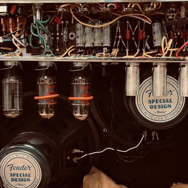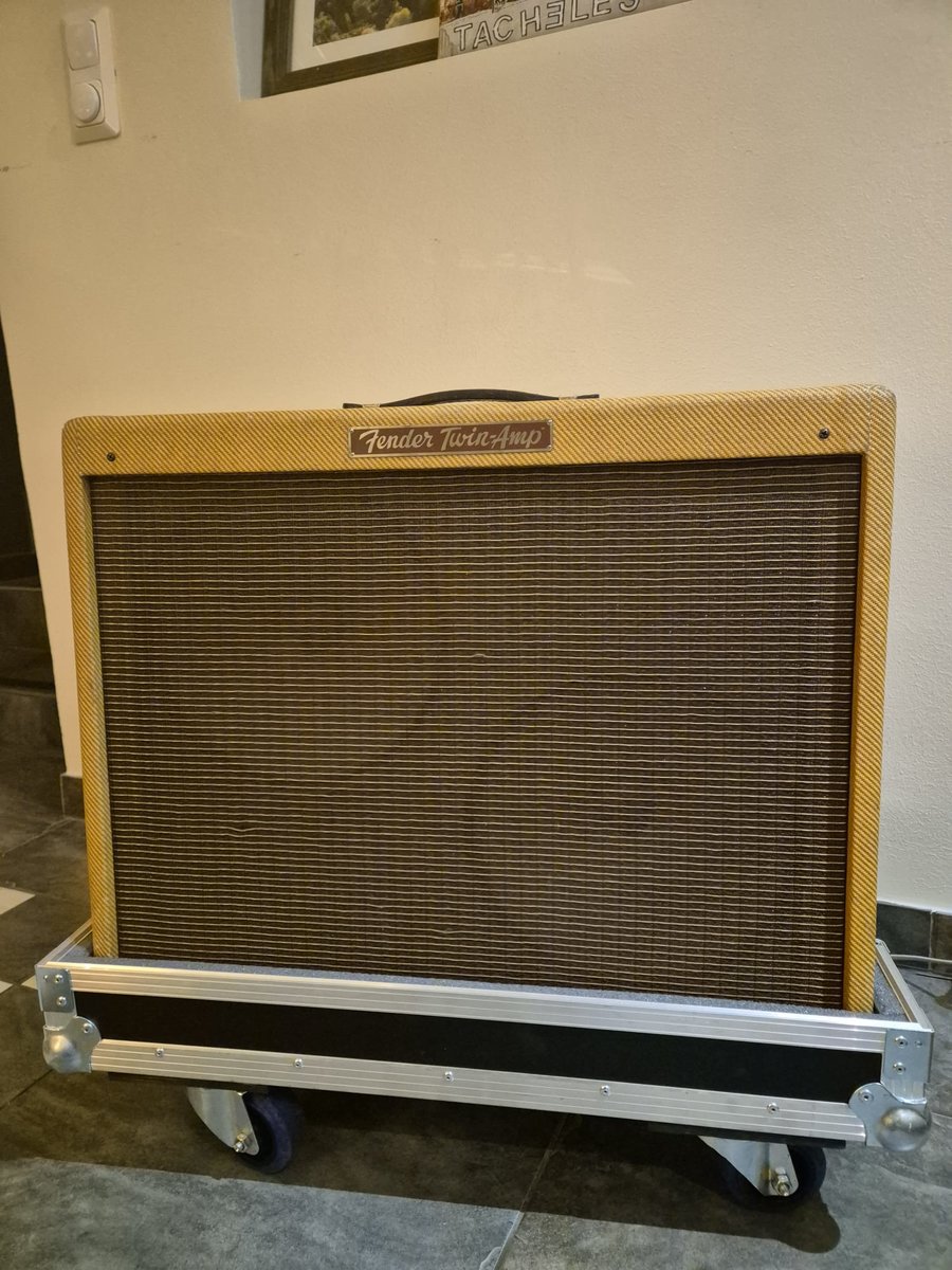 Vahvistimet / Fender `57 Custom Shop Twin Amp 5E8-A 2004 Point-to-Point tweed combo ja sen 40 suloista wattia Pääte: 2x6L6/Etuaste:1x12AY7, 3x12AX7/Tasasuuntaus: 2x5U4 Kaiuttimet: 2×12″ Eminence Fender Special Design Alnico by Weber suojahuppu, huoltotarkistettu Kaiutinelementit: 2x12" Eminence Fender Special Design Alnico by Weber Hinta: 1700 € | |