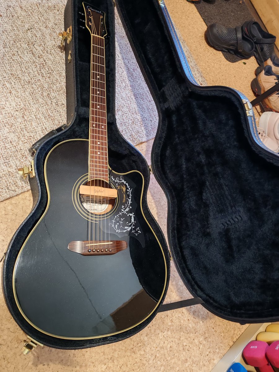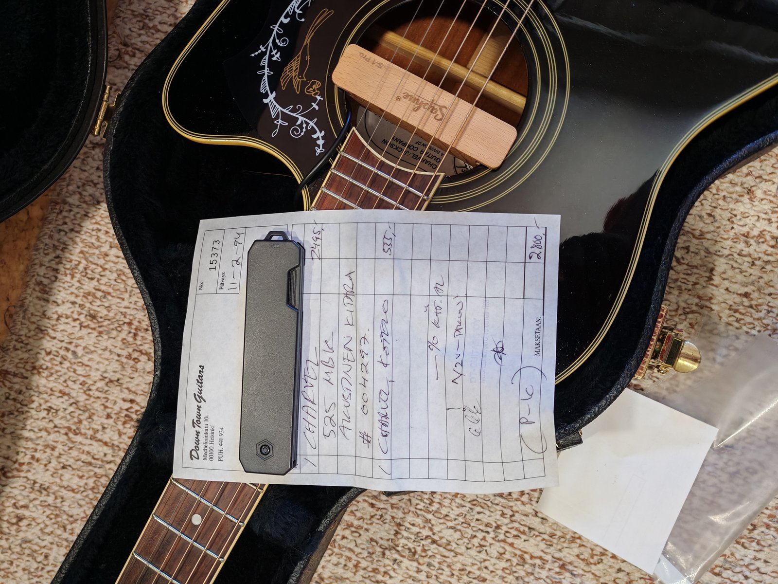 Tästä vintage kitaraa, hienossa kunnossa. Metalli musta väritys, uusi virytyskoneisto ja kielet laitettu juuri. Mikki toimii hienosti, ei kierrä kovissakaan volumeissa. Laukku alkuperäinen. Osto kuitti (markka aikaa) löytyy. Valitettavasti takuu on mennyt 29 vuotta sitten😆. Lähetys onnistuu, kuten myös koesoitto. Hinta: 300 € | |