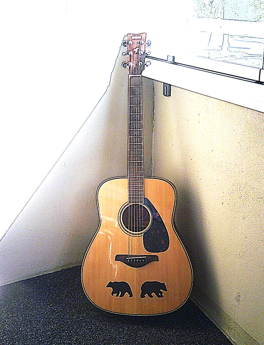 Luotettava perussoitin. Tallaa madalsin uutena (2021), kevytsoittoinen, ei ole tarvinnut kertaakaan sen koommin säädellä, Yamahan kaulat eivät vääntyile. Ei naarmuja eikä kolhuja. Kahden karhun koristemaalaus (akryyliväri) tekee kitarasta uniikin. Hinta: 220 € | |