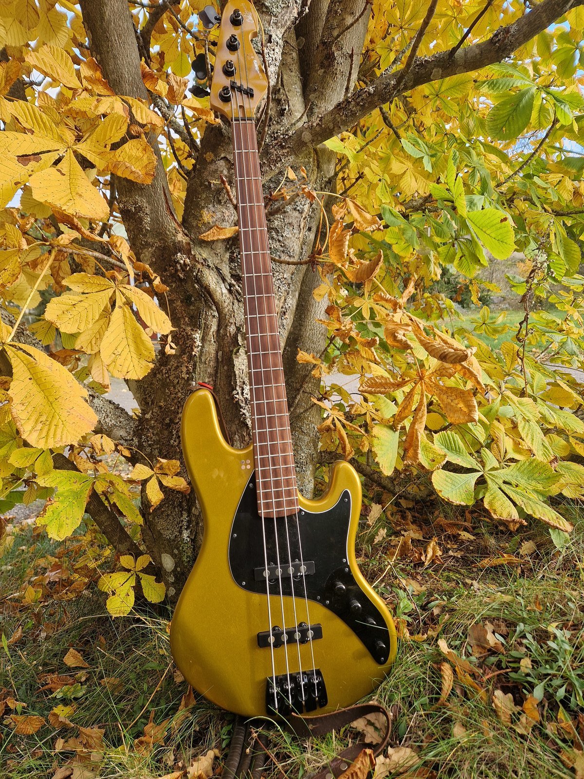 Sandberg TT4 with matching headstock. This has the Delano JMVC4 split coil humbuckers in it, a little more unusual for a jazz bass. Active/Passive. Great condition comes with a Sandberg Gig bag and an extra white pearl pickguard. 3.6kg Hinta: 1100 € | |