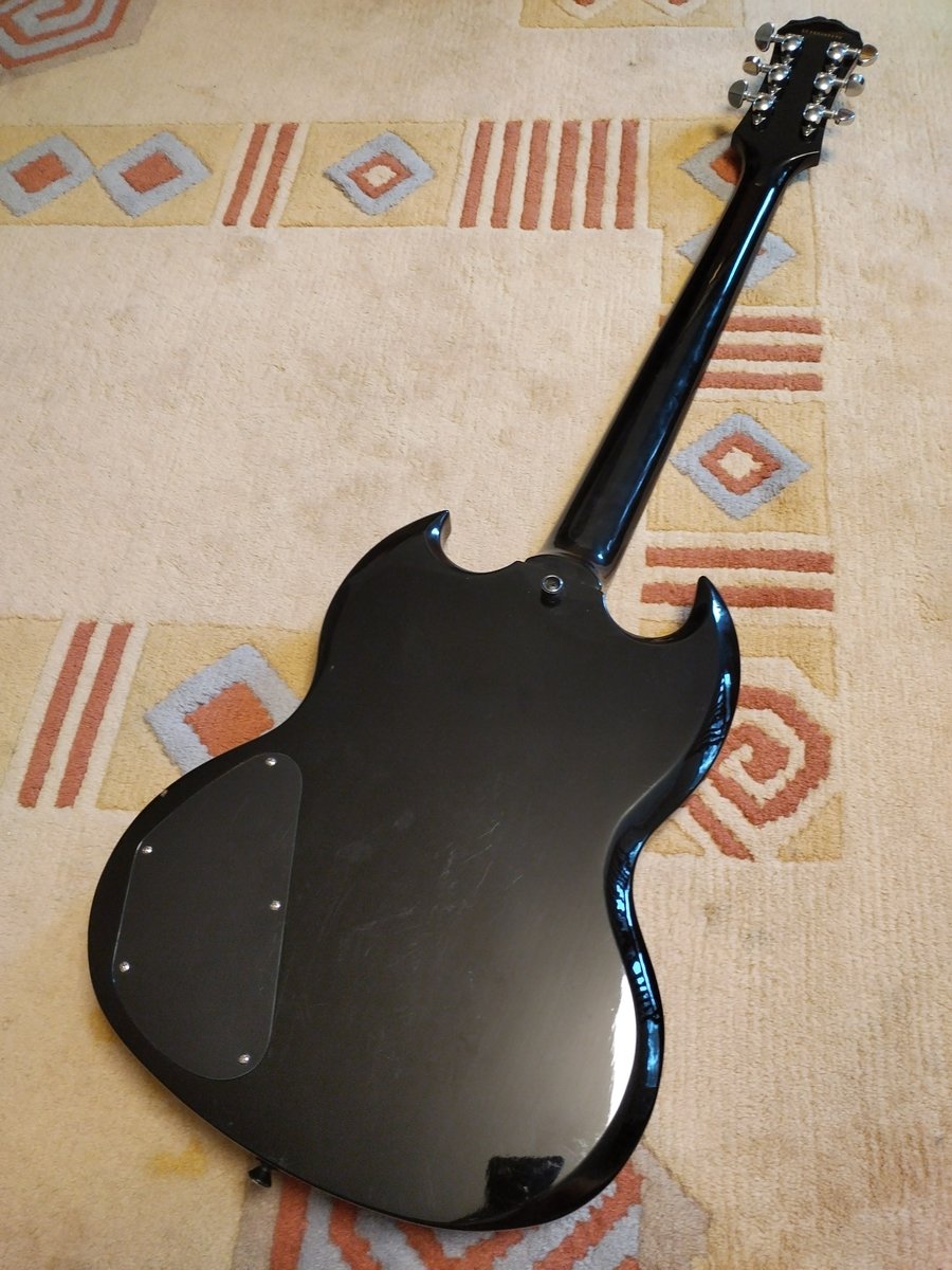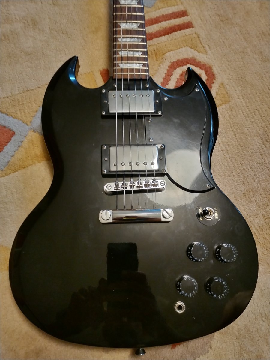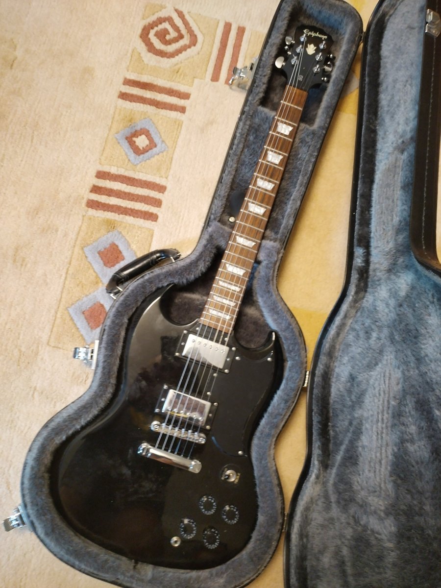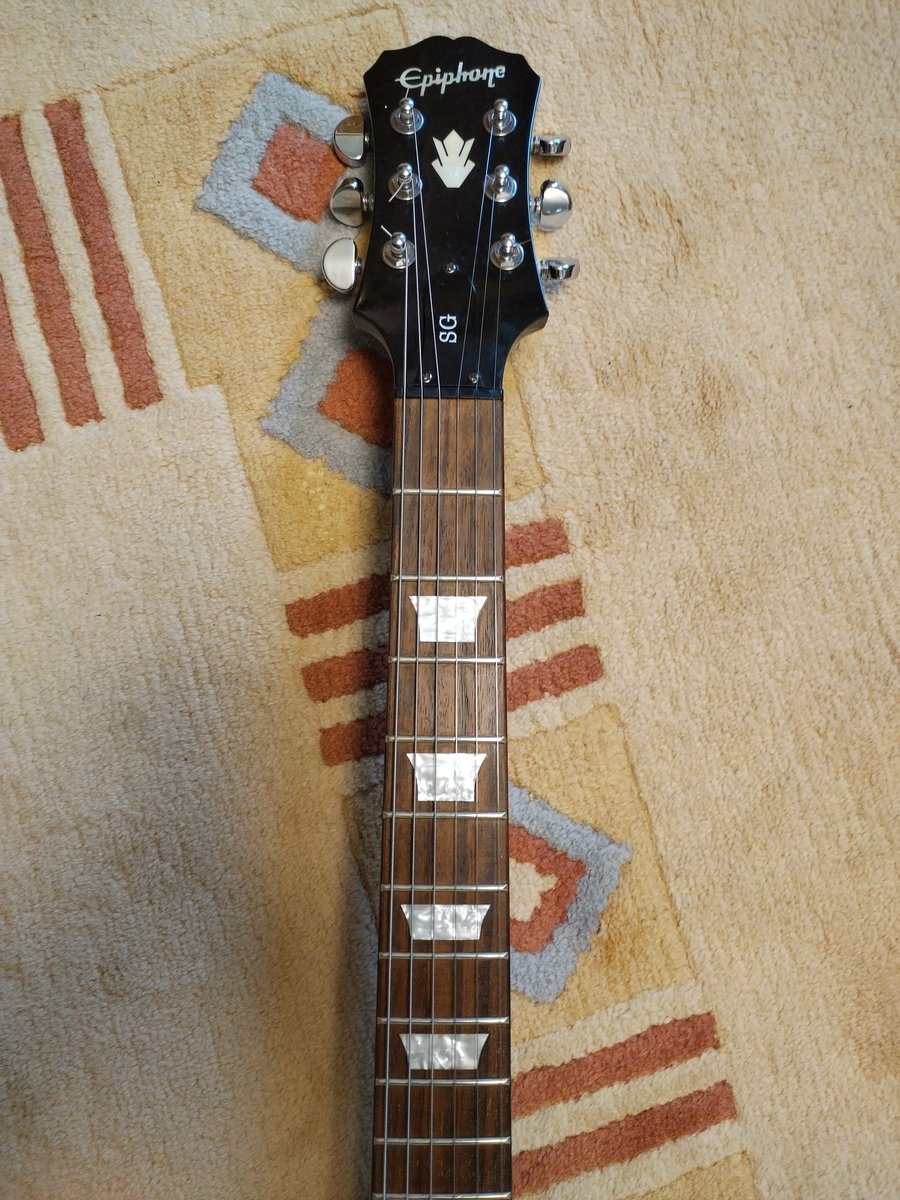 Siisti ja hyväsaundinen solid guitar. Mahonki body/kaula. Nauhat hyvät. G-400 humppari mikit. Tune-o-matic talla. Grover virittimet. Mukaan Epiphonen oma laukku. Lähetys onnistuu. Hinta: 320 € | |