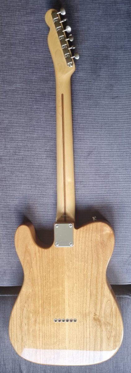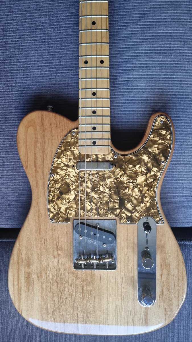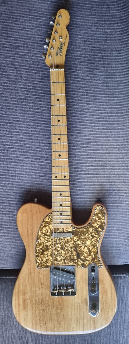 Telecaster tyylinen sähkökitara. Made in Japan. Oikein hyvässä kunnossa, takana dingi, josta kuva. Plektrasuoja ei alkuperäinen, tuon vaihto mustaan tai valkoiseen onnistuu tarvittaessa. Kitaraan vaihdettu DiMarzio Twang King mikit ja Allpartsin tallapalat. Kitara on huollettu ja säädetty. Mukaan Gator Cases kova laukku Body: Three-piece lightweight ash Neck: One-piece Canadian maple, U-shape Fingerboard: Canadian maple, 21 frets Scale length: 647.7 mm (25.5") Saddle width: 42 mm (1.65") Strap: Sanko SBB-214 (Medium size), made in Japan Bridge: Tokai original TE-VB Bridge Saddle: Legs Tuning Machines: Gotoh SD91-05M Pickups: DiMarzio Twang King Controls: 1 x volume, 1 x tone, 1 x 3-way switch Strings: GHS 09-42 Included: Hard shell case (reference ST/TE Tweed) Certificate: Certificate of Origin Production: Made in Japan Lacquer: Polyester Finish: Off White Blonde Tässä linkkiä, tosin eri väriseen: https://www.soitinjylha.fi/product/ … tokai-tte-55b-maple-3-tone-sunburst Hinta: 800 € | |