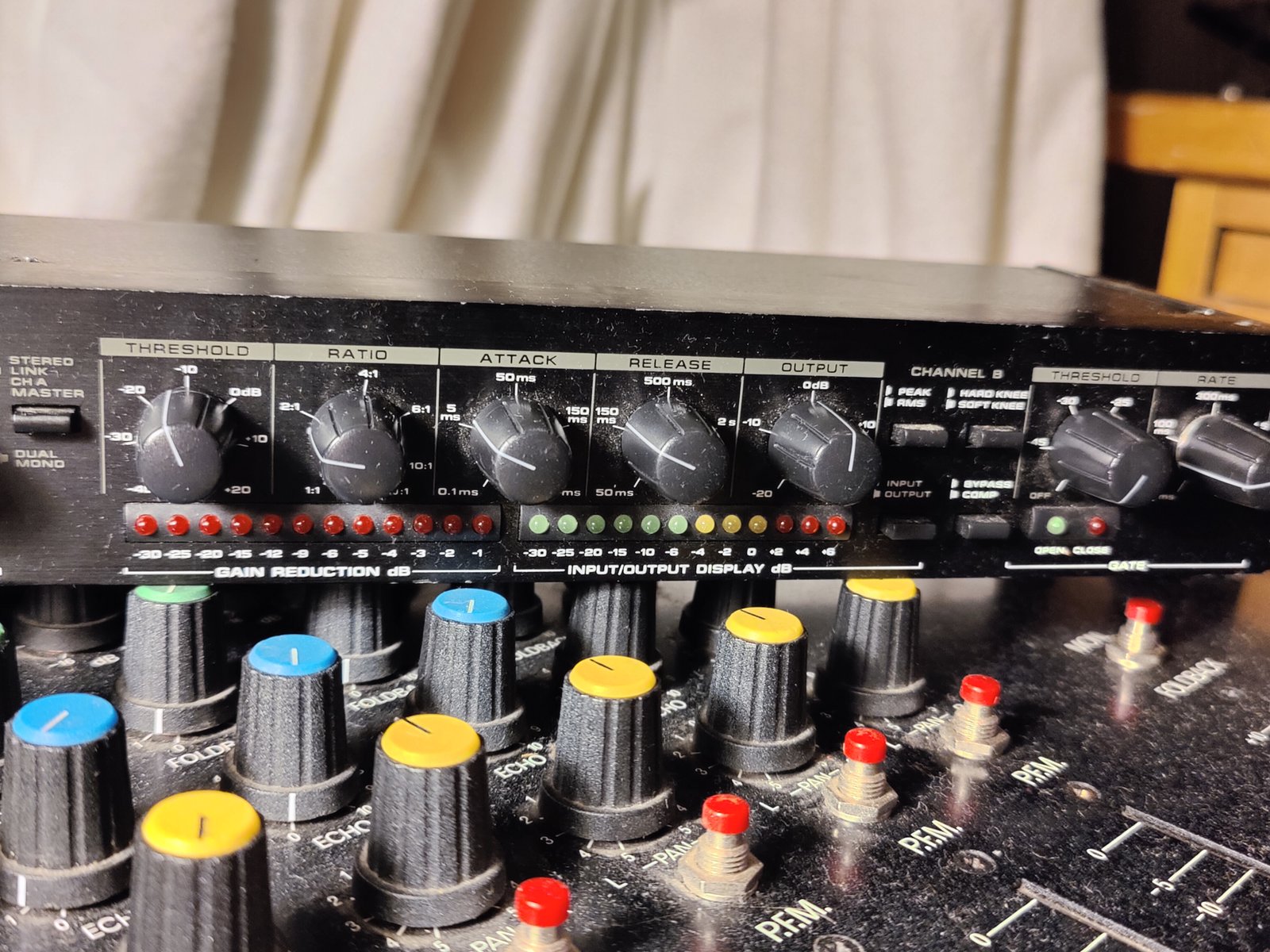 Edullinen kompura, mutta ehkäpä mainettaan parempi... Löytyy peak/RMS- valinta, hard/soft knee-asetus, stereo tracking/dual mono -valinta ja melko laajat säädöt, joten kyllä tällä tekee kaikenlaista sen kuuluisan Daft Punk-pumppauksen lisäksi. Youtubessa esimerkkiä https://www.youtube.com/watch?v=MWBO-C5mfnk Käytön jälkiä on, mutta ainut "vika" on että 2. kanavan gaten (huom. ei siis edes kompuran) aikavalinta pyörii ympäri. Toimii siis kuitenkin täysin, mutta potikka ei vaan pysähdy misssään. Stereomodessa laite seuraa 1. kanvan säätöjä. Hinta: 100 € | |