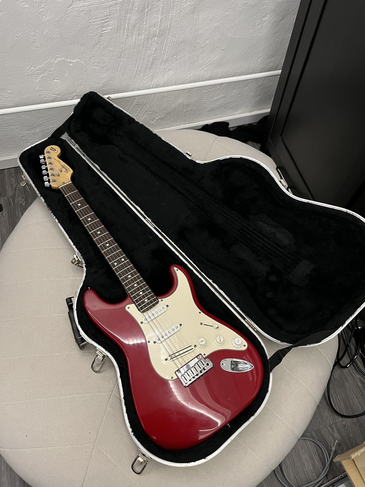 Myydään kaverin puolesta hieno 94 anniversary jenkki strato. Kunto moitteeton ja nauhat hyvässä hapessa. Värinä dakota red. Tallamikkinä joku dimarzion railssi. Mukaan harvinainen red label fender kova laukku. Lähetys ostajan piikkiin Hinta: 1200 € | |