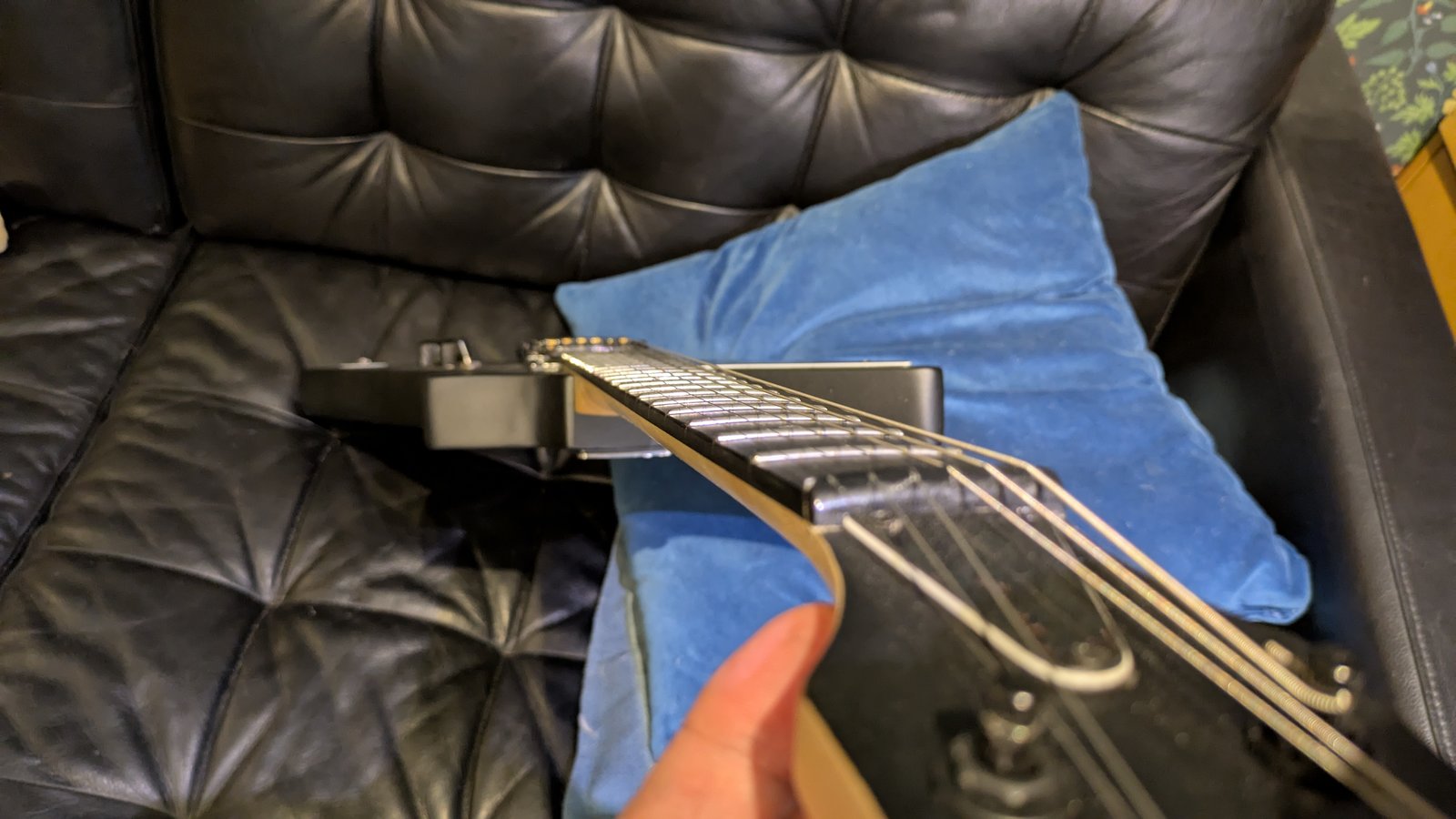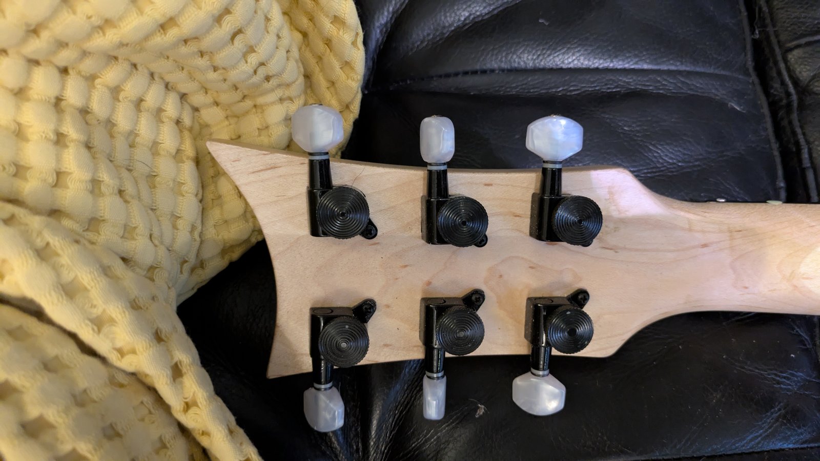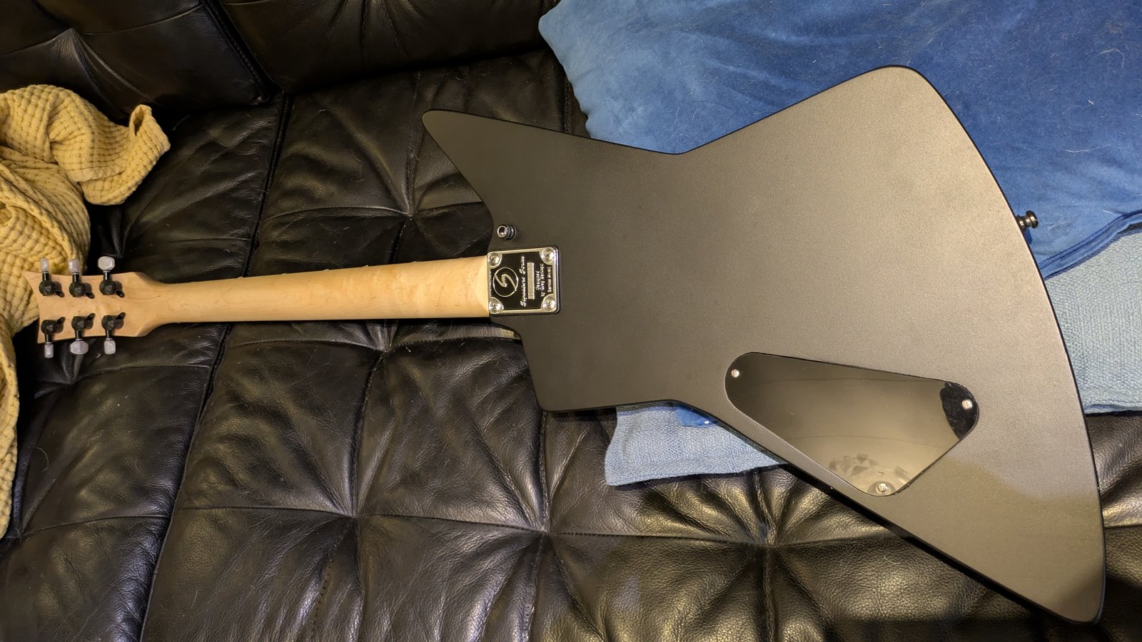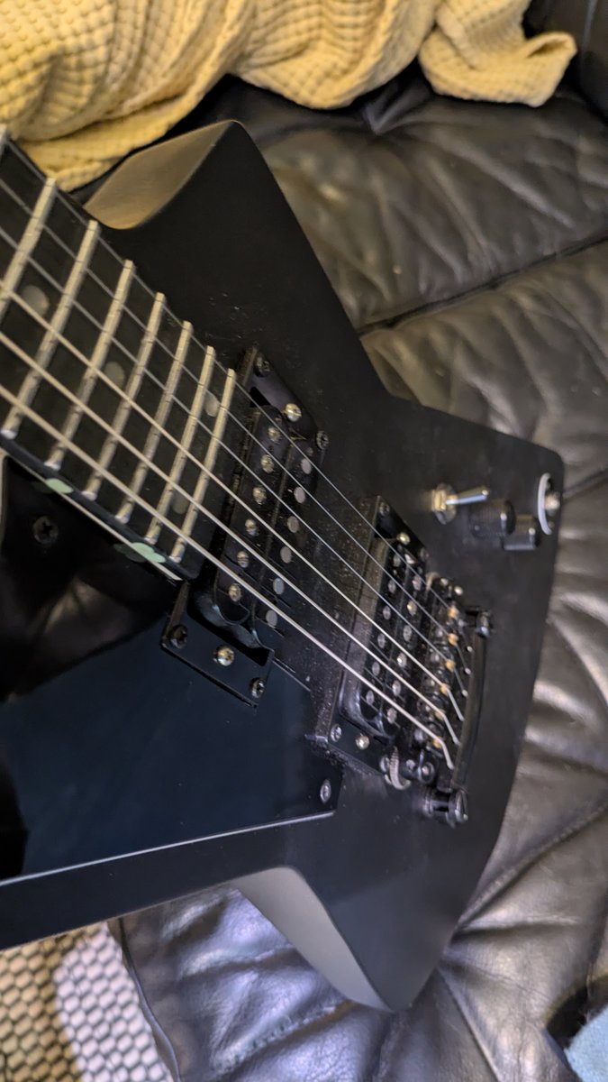 | Kulkeutuu tarvittaessa Joensuuhun. Laitetaan nyt tämäkin myyntiin, kun kitaroita pursuaa joka nurkassa ja eipä tule kuitenkaan soitettua muilla kuin V malleilla näköjään todellakaan. Siitä erittäin seksikäs ja varmasti uniikki sekä laadukas D-A built keppi. Tein itselleni mattamustan Veen kaveriksi mutta eipä ole tullut kuin kahdella keikalla soitettua ja taas kaksi uutta veetä valmistuu niin tehdään tilaa jostain päästä talliin jos niikseen tulee - ei pakkomyynnissä, menee jos menee. Teen sitten joskus uuden samanlaisen jos alkaa kaduttaa. Kitara on tasapainoinen ja painaa vain 3kg - inhoan painavia kitaroita- kaula vaahteraa ja body Indonesian mahonkia eli Rengasta, mattamustalla nitrolla maalattu. Melkolailla vielä naarmuton, pieni kolhu näkyi ylä-takareunassa olevan. Action on säädetty low, ~1.3mm @12, ei superlow, ja kaula muotoiltu enemmän jämerän ja luotettavan suuntaan enempi keikkakäyttöä ajatellen kuin tikunohueksi shredderiksi. Ei ole mikään paksukaan kuitenkaan, normaalit 22mm about. - Rosterinauhat Hosco jumbo - Rosterinen nollanauha Sintoms, aina täydellinen kielten korkeus - 14" radius - Gibson skaala, 24 nauhaa - Gibson 498t muutettuna Ceramic-8 magneettille - Kaulassa Blade Levinson - Tonepotikka ohitettu turhana - lukkovirit - rullatalla - hihnalukot - Paino tasan 3kg - Satulan leveys 42mm, kaula 1.välin nauhan päältä ~22mm - Gewan pehmeä explorer-pussi mukaan EI vaihtoja ellei ehkä osavaihtoja, tai joku Jackson RR vaikka raato ehkä jossa ei olisi kauhean ohut kaula, vaan josta pystyisi vielä muokkaamaan käteen sopivan ja KIINTEÄllä tallalla. Hinta: 500 € | |