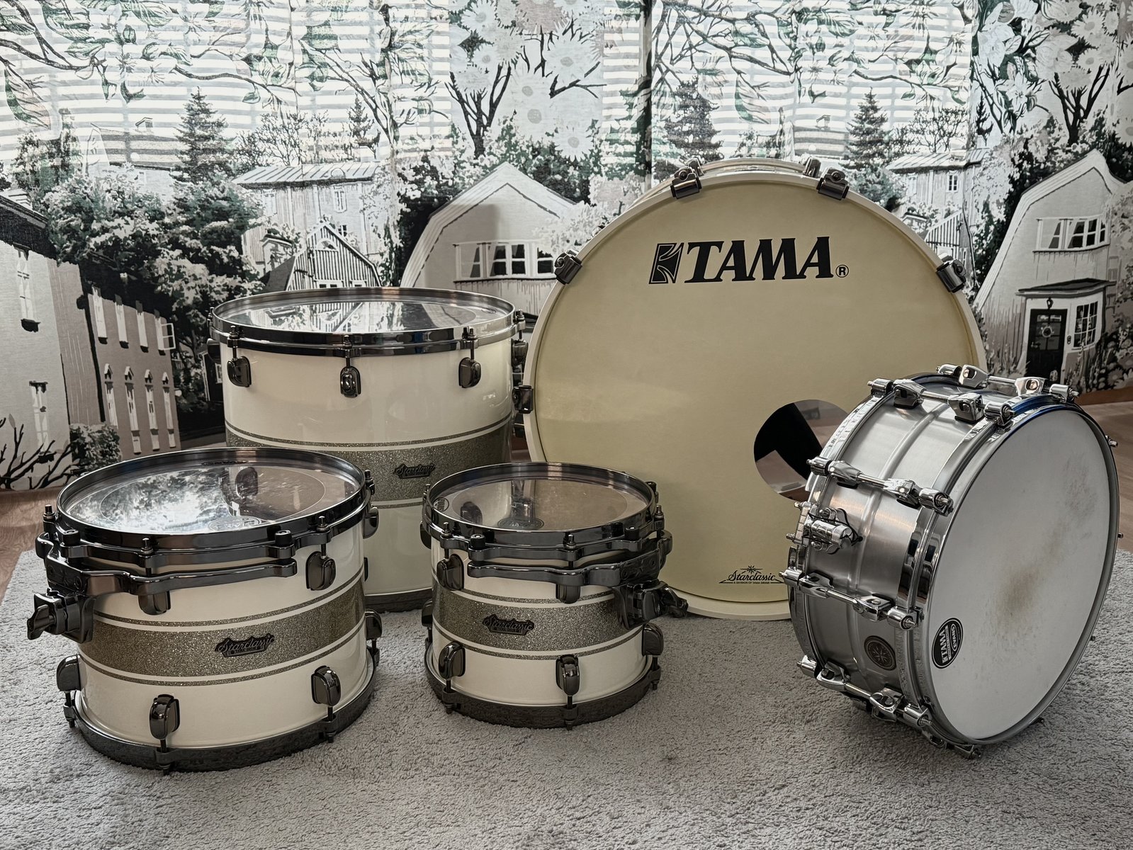 Harvinaista herkkua tarjolla! Taman huippusetti vuodelta 2010. Ollut vain viikon studiossa käytössä, sen jälkeen 15 vuotta lämpimässä varastossa Taman omissa pehmustetuissa kuljetuskasseissa. Käytön jälkiä ei ole kuin alkuperäisissä Evansin Genera G2 kalvoissa. Setti on kuin uusi. 22x20 BD 10x8 TT 12x9 TT 16x14 FT 14x6 Tama Starphonic Aluminium-virveli Telineet neljälle pellille, sekä räkkitomeille. Lisäksi Taman haitsu-teline. Bassarille, tomeille ja virvelille Taman pehmustetut kuljetuskassit. Yhteydenotot WA kautta. Hinta: 4500 € | |