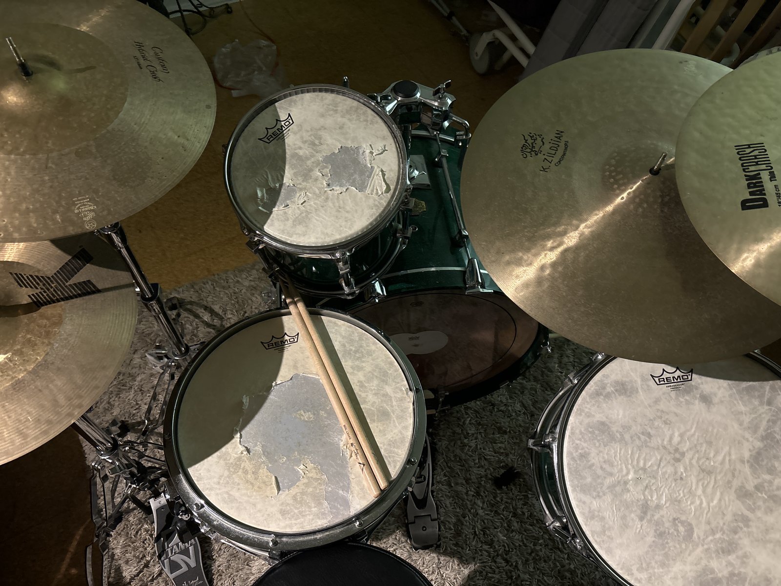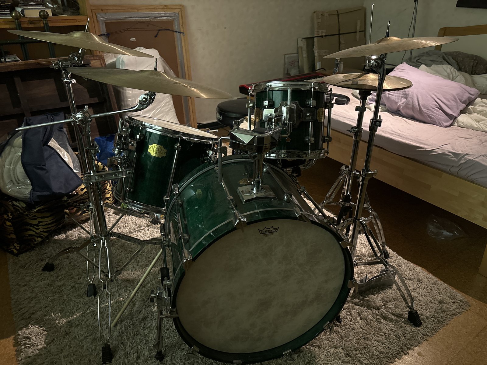2016 eBaystä tilasin tämän setin Briteistä Suomeen. Sen koommin soitto on ollut mannaa, mutta nyt on pakko ostaa sähkörumpusetti, koska asun kerrostalossa. Sis. 22” basari, 10” tom, 12” tom ja 15” tom, jolla clamppikiinnitys ridesymbaalitelineeseen. Telineet ja symbaalista eivät sisälly hintaan. Upea setti varsinkin ikäisekseen, laatu on täysin priimaa, setti on Premierin lippulaivasetti 1990-luvulla valmistetuissa seteissä. Miinuksena pieni halkeama 15” tomissa, tämä on otettu mukaan laskiessa hintaa. Hinta: 1500 € | |