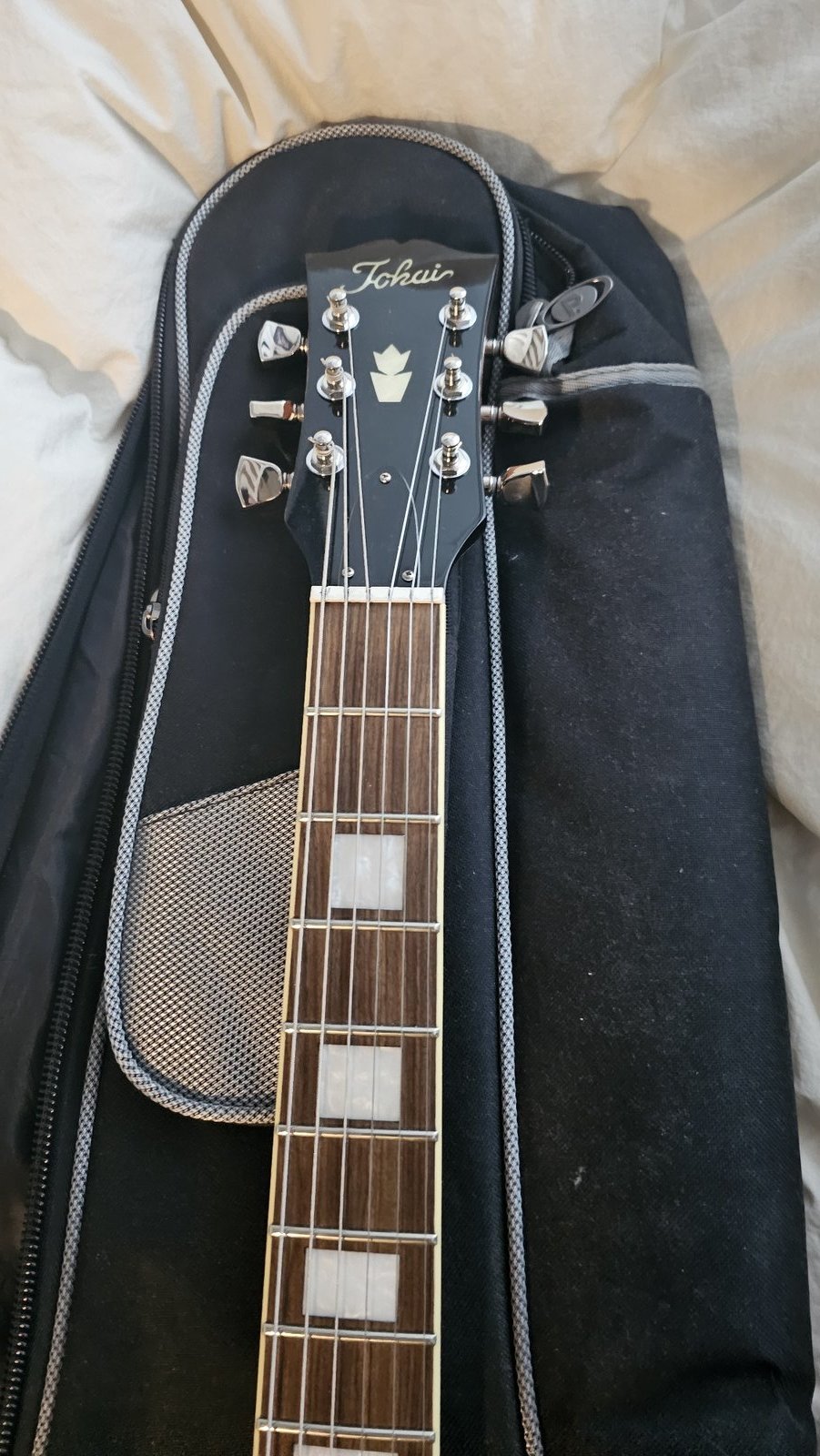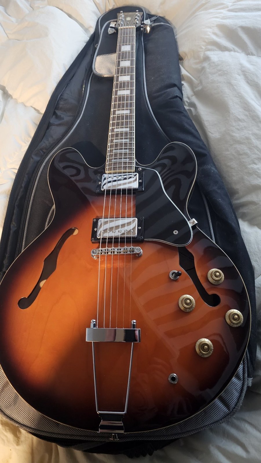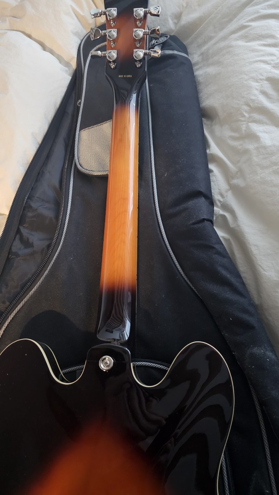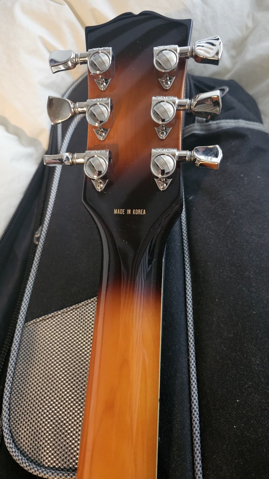 Parempaa Korean laatua. Jämerästi soivat puut, hyväsoundiset semikuumat orkkismikit 8,4 ja 9,0 kohm. Grover USA virittimet. Ikää tai mallinumeroa mahdoton sanoa, mutta kunto on siisti ja nauhat hyvät. Melko harvinainen malli. Ihan helpolla ei löydä samanlaista. Trapetsitalla 60-luvun Gibsonin tyyliin. Paino noin 3,45 kg. Mukana gigbag. Ei tarvetta vaihdokeille. Lähetys Matkahuollossa 35,90 euroa. Hinta: 1190 € | |