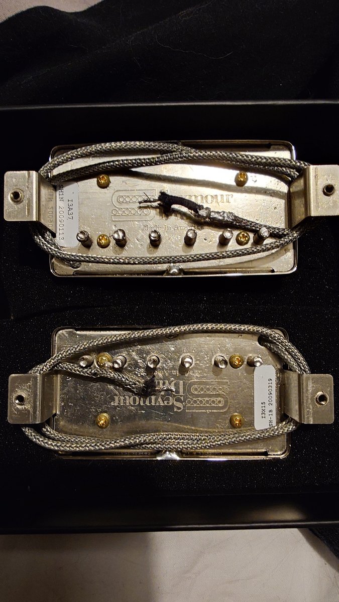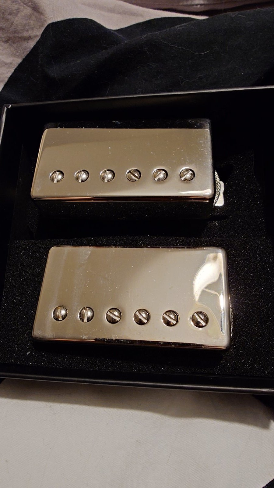 Myynnissä otsikon mukainen setti nikkelikuorilla (tai kromi, kumpi näissä nyt on). Hyvässä kunnossa. Pitkillä jaloilla ja 1c braided shield -johdoilla. Piuhoja ei ole pätkitty. Vaihtuu euroihin, tai ehkä kuumempiin Duncanin mikkeihin mustana tai ehkä kuorilla. Vain settinä myynnissä. Tästä erinomainen P.A.F.-tyylinen setti kovaan käyttöön. Hinta: 180 € | |