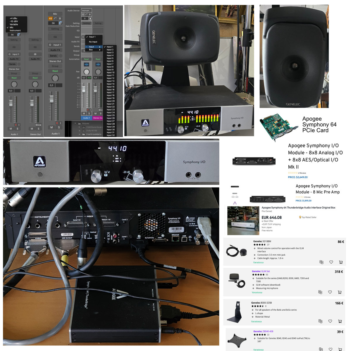 | - Apogee Symphony I/O MK1 - Symphony 64 | ThunderBridge (tällä saa systeemin liitettyä läppäriin) - MK 1 16x16 Analog and 16x16 AES w PCIe card - Apogee 8 Mic Preamp - Symphony I/O Module - Apogee Symphony 64 PCIe Card Löytyy myös vanha Mac Pro (harmaa loota), jossa PCi korttipaikkoja ja myös äänetön "roskapönttö" mac Toimii mainiosti ainakin Logic Pron kanssa, josta suoraan ohjelmasta voi tehdä asetuksia ja säätöjä. Genelec - 8341 kaiuttimet - 8000-325B pöytä jalustat - 9310BM Wired volume control - GLM Set Measuring microphone - Jotkut kumialustat joissa lukee 236 8040 - 8 CH mikrofoni kaapeli ja 8 ch AEC kaaplie sekä muut välijohdot. Koko systeemi on kuunneltavissa Lahdessa. Vaihdossa käy resonaattori kitara, 4K kamera, vanhat Canonin FD L optiikat. Voin myydä erikeen. Apogeet 2900eur, Genelecit 3900eur, Hinta: 6400 € | |