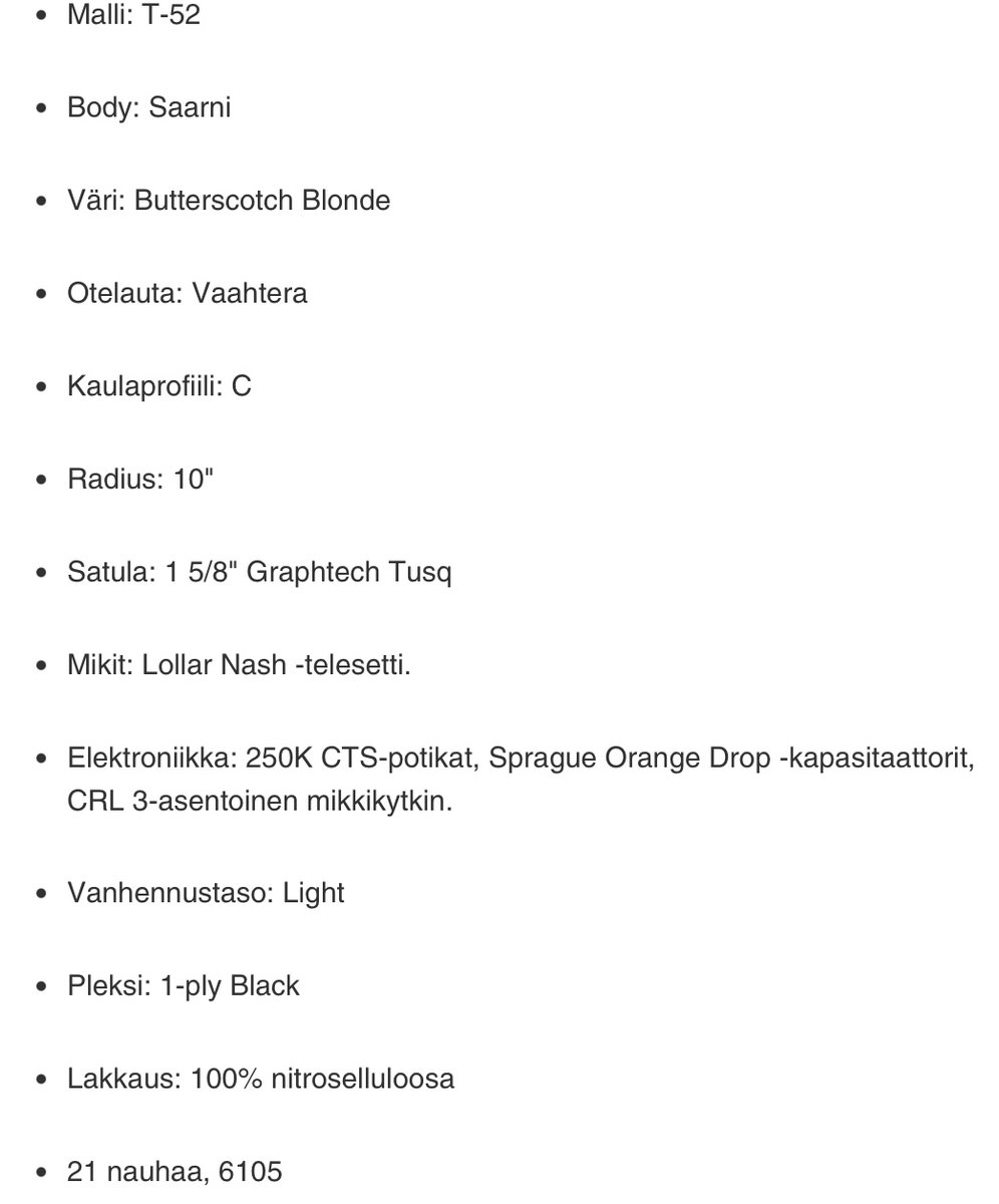 Hyvä jenkkitele joutilaana. Erittäin miellyttävä kaula ja hyvät Lollarin mikit. Valmistettu loppuvuodesta 2020. Kulkee Nashin omassa hienossa laukussa. Yhteys aluksi pika- tai tekstiviestillä. Hinta: 1785 € | |