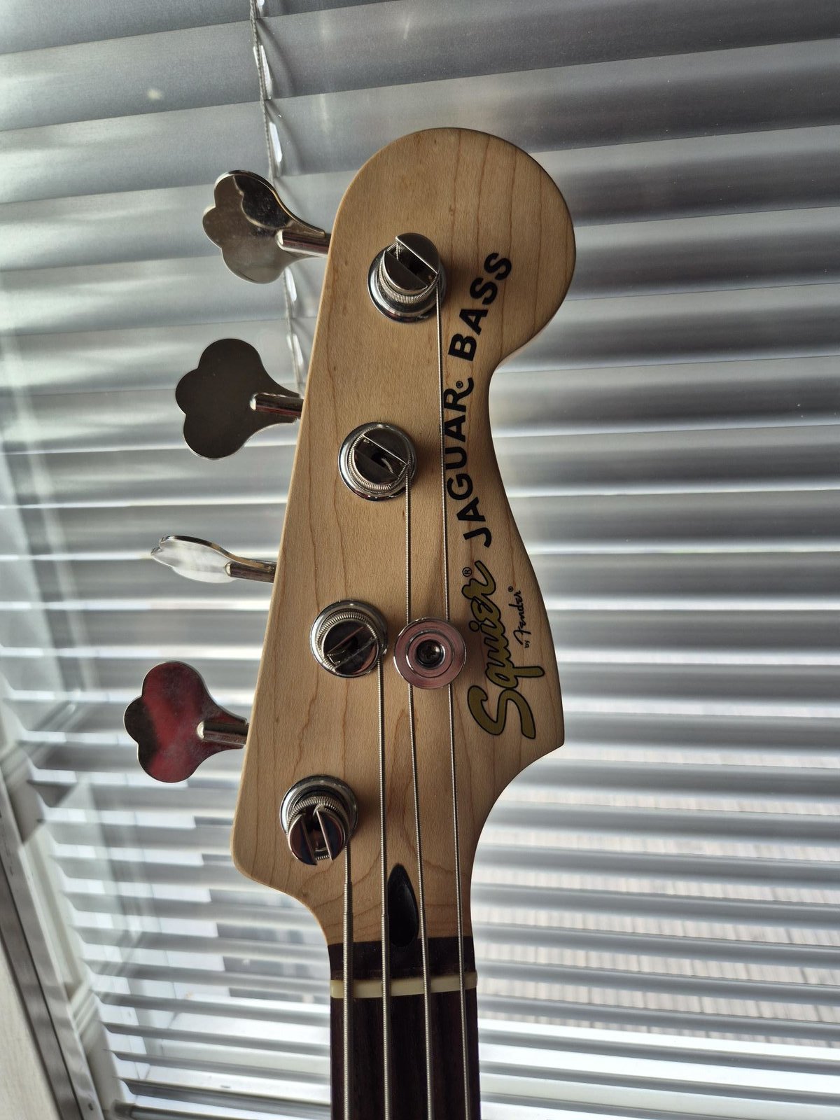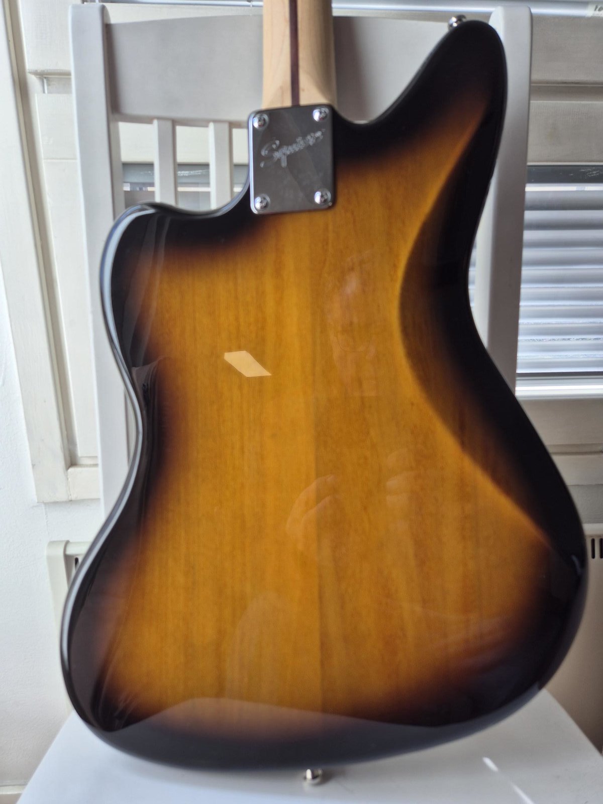 Lyhytskaalainen Squier Jaguar-basso 30" skaalalla. Vintage Modified-sarjaa. PJ-mikityksellä. 2-tone sunburst, josta näkee, mitä puuta runkoon on käytetty. Tasapainoinen hyvä soitin. Ei neck-dive, niinkuin ne läpivärjätyt mustat ja punaiset. Made in Indonesia. Bassoa on paranneltu seuraavasti: Schaller-virityskoneisto, luusatula, Lollar ja J.Salo-mikit, sähköt. Lisätietoa näistä kiinnostuneille. Soitin on siis hyvin keikkakuntoinen, pysyy ja on vireessä. Kuvissa on heijastuksia, lakkapinta on virheetön. Hinta: 450 € | |