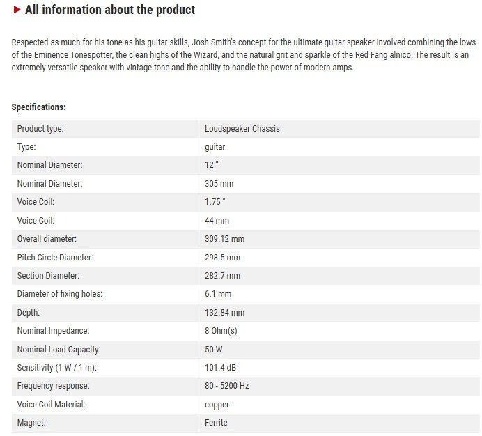 | Tästä hieman harvinaisempi kaiutin. Josh Smithin mukaan Wizardin ja Tonespotterin risteytys kyseessä. Tässä Smithin itsensä kertomana: https://www.youtube.com/watch?v=ITReyFf6iM4 Orggisloota hukassa, toimitus Celestionin laatikossa. 50 W, 8 Ohmia, 12 tuumaa Lähetys ¤10,90. Hinta: 80 € | |